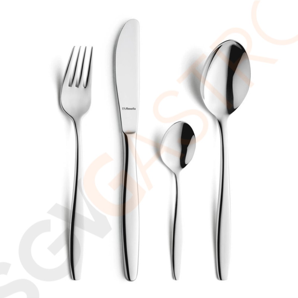 Moderne Besteckserie aus hochglanzpoliertem 18/10 Edelstahl. Verkauft im 12er Pack.