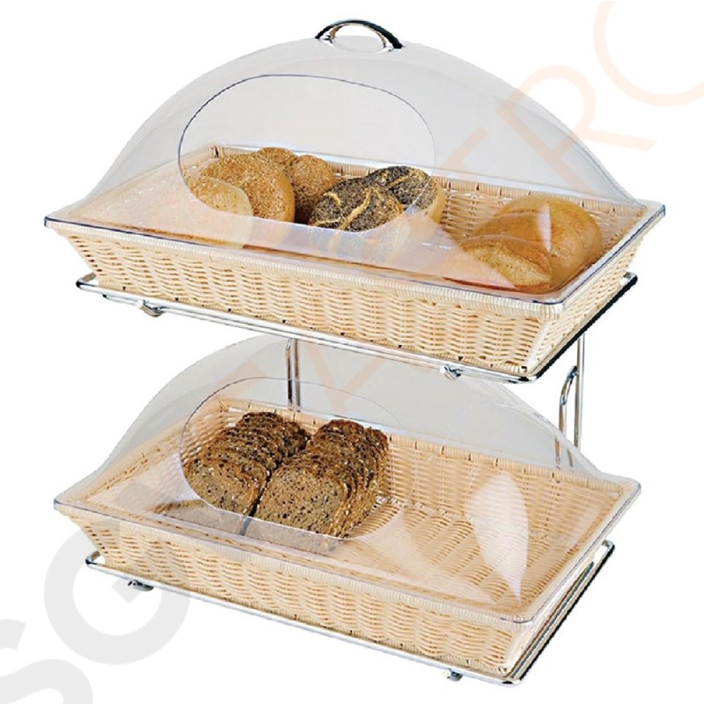 Verchromter Ständer mit 26cm Abstand zwischen den beiden Ebenen für den Einsatz mit 1/1 GN-Größe Rattankörben aus Polypropylen und Hauben (Körbe und Hauben separat erhältlich). Korb mit Edelstahlrahmen für zusätzliche Stärke.
