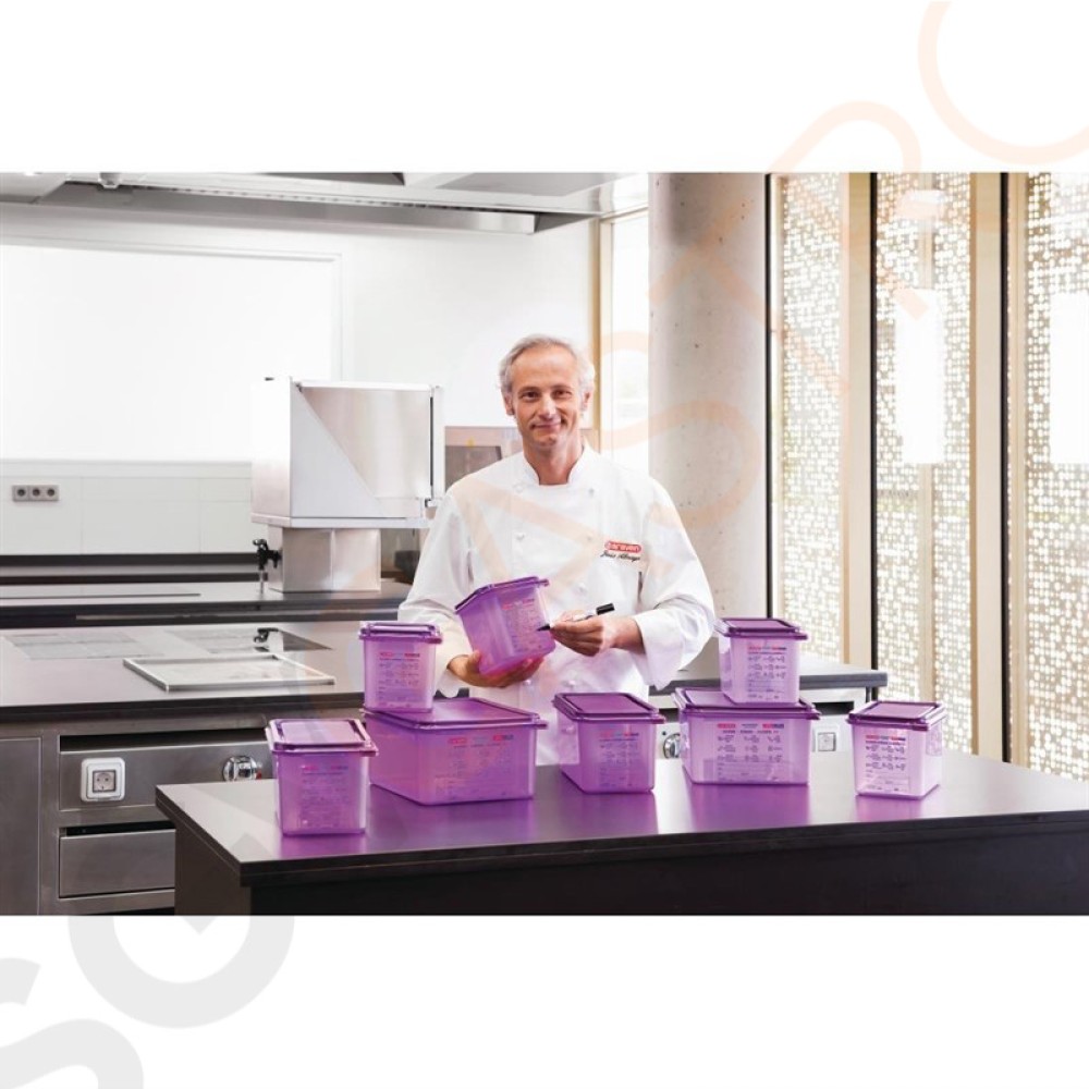 Verhindern Sie Kreuzkontamination bei der Lebensmittelzubereitung für Menschen mit Lebensmittelallergien und -intoleranzen. Transparent für optimale Übersicht über den Inhalt mit festem Etikett. Temperaturbeständig von -40°C bis +95°C.