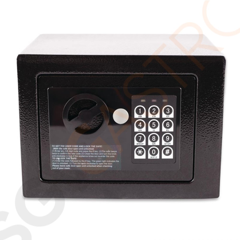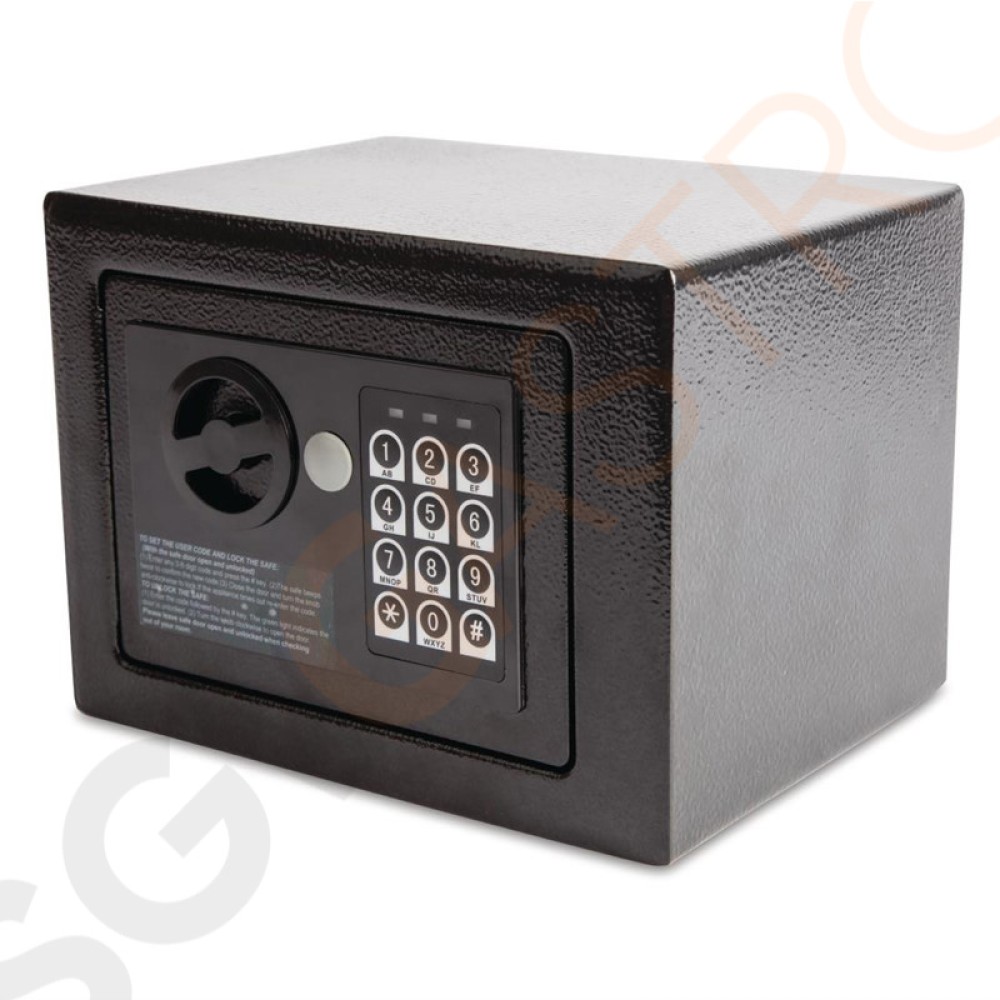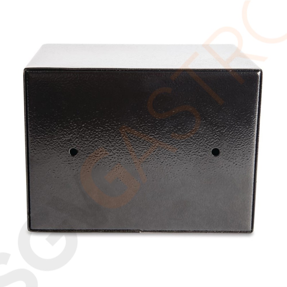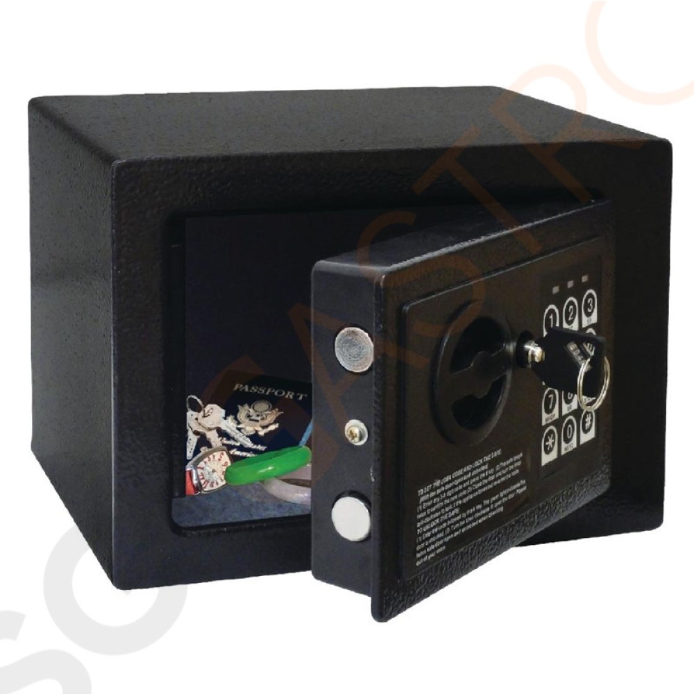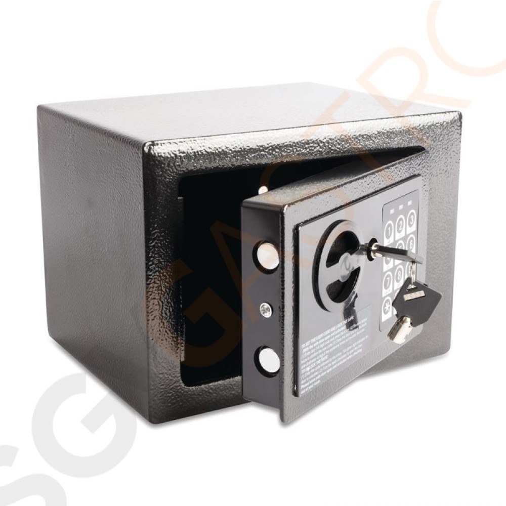 Stahlsafes zur Aufbewahrung wertvoller Gegenstände, wie Portemonnee und Reisepass. Boden- oder Wandmontage für mehr Sicherheit. Mit zwei Masterschlüsseln und einem Gästeinformationsblatt.