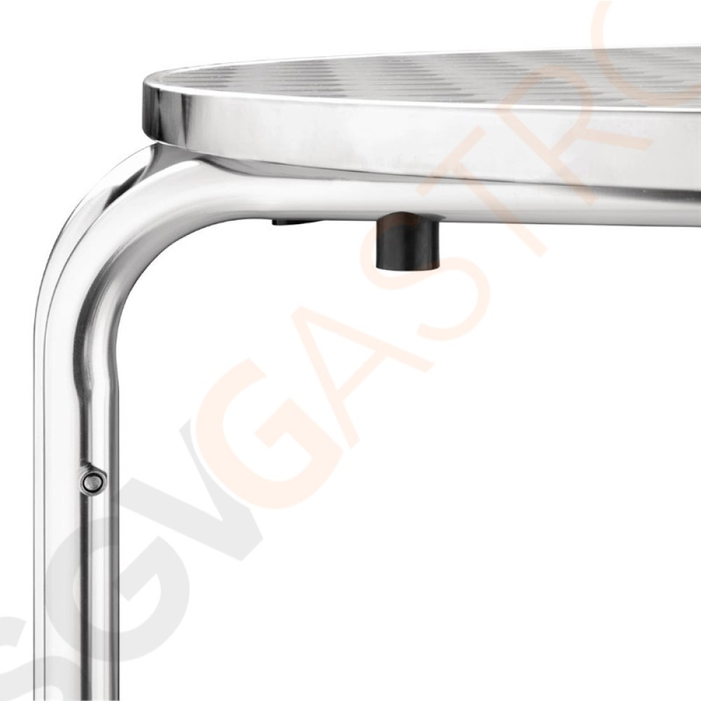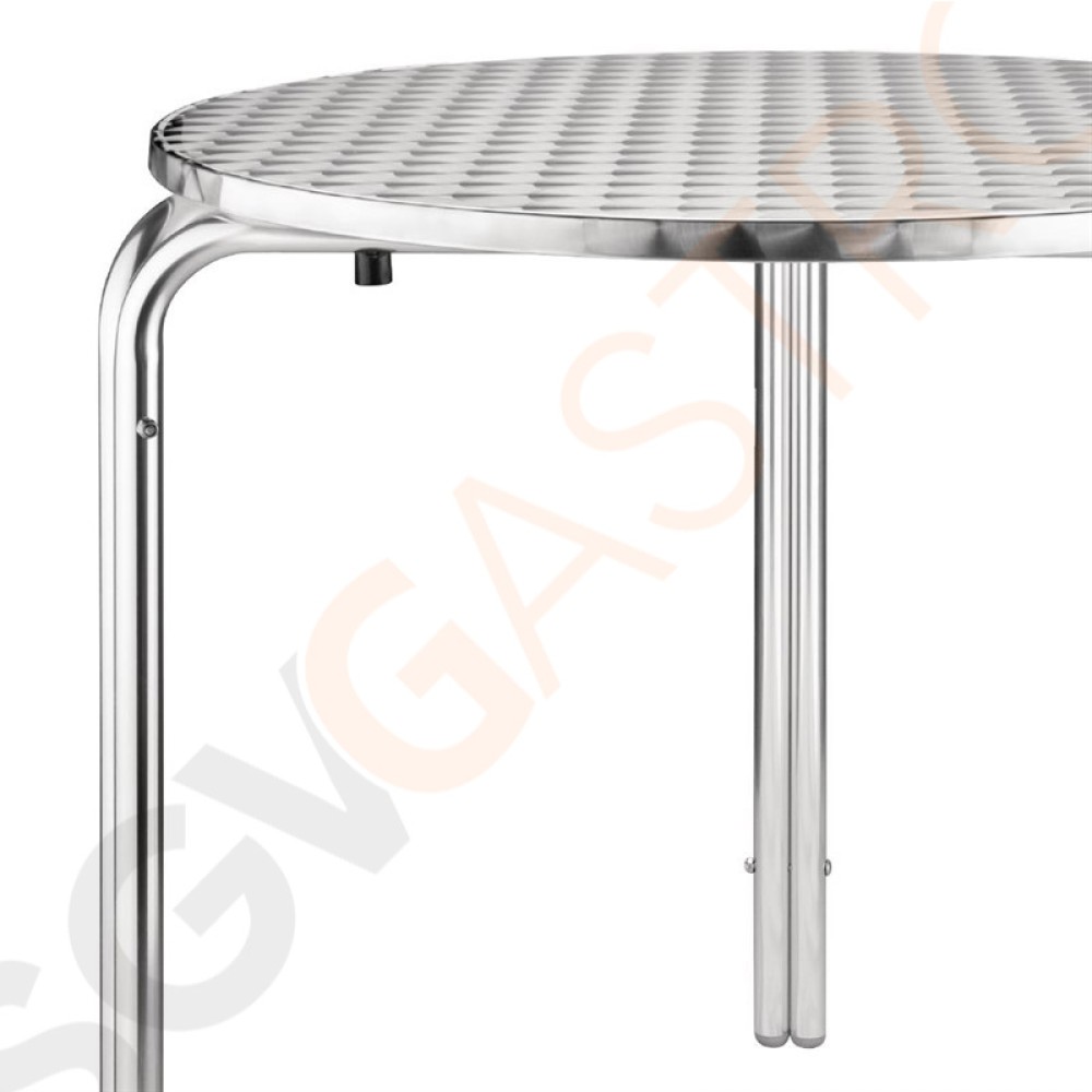 Tisch mit Edelstahlplatte für Innen- und Außengebrauch. Absolut wetterbeständig und unterhaltsfrei. Stapelbar für einfache Lagerung und Transport.