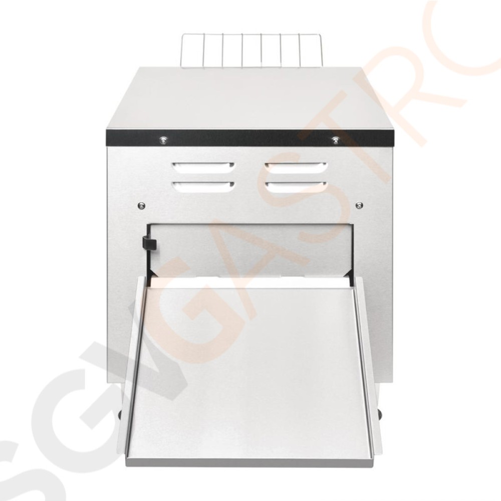 Kompakter und einfach zu bedienender Durchlauftoaster aus Edelstahl, der die fertigen Toastscheiben wahlweise an der Vorder- oder Rückseite ausgibt. Die Krümelladen können einfach herausgenommen und gereinigt werden. Mit zwei Heizelementen und verschiedenen Kontrollreglern kann die Ausgabe individuell und passend zur Nachfrage gesteuert werden.
