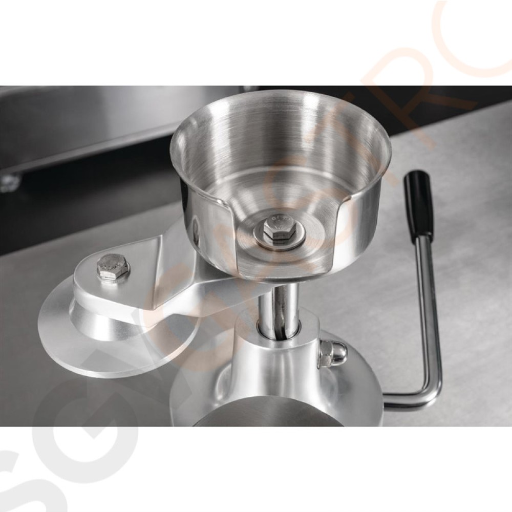 Leicht zu reinigen und zu pflegen aus eloxiertem Aluminium. Manuell zu bedienende Burgermaschine für einheitliche Größe und Form von Hamburgern. Ideal für kleine Metzgereien.