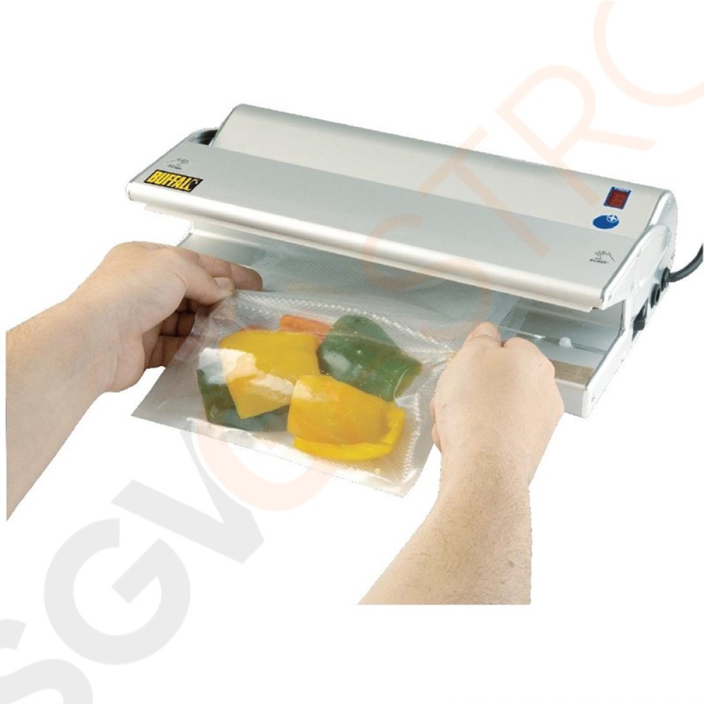 Verlängern Sie die Haltbarkeit von Nahrungsmitteln mit dieser Maschine. Sparen Sie Geld durch weniger Lebensmittelverschwendung und Zeit durch Vorbereitung. Für die Verwendung mit Beuteln bis 30cm Breite.