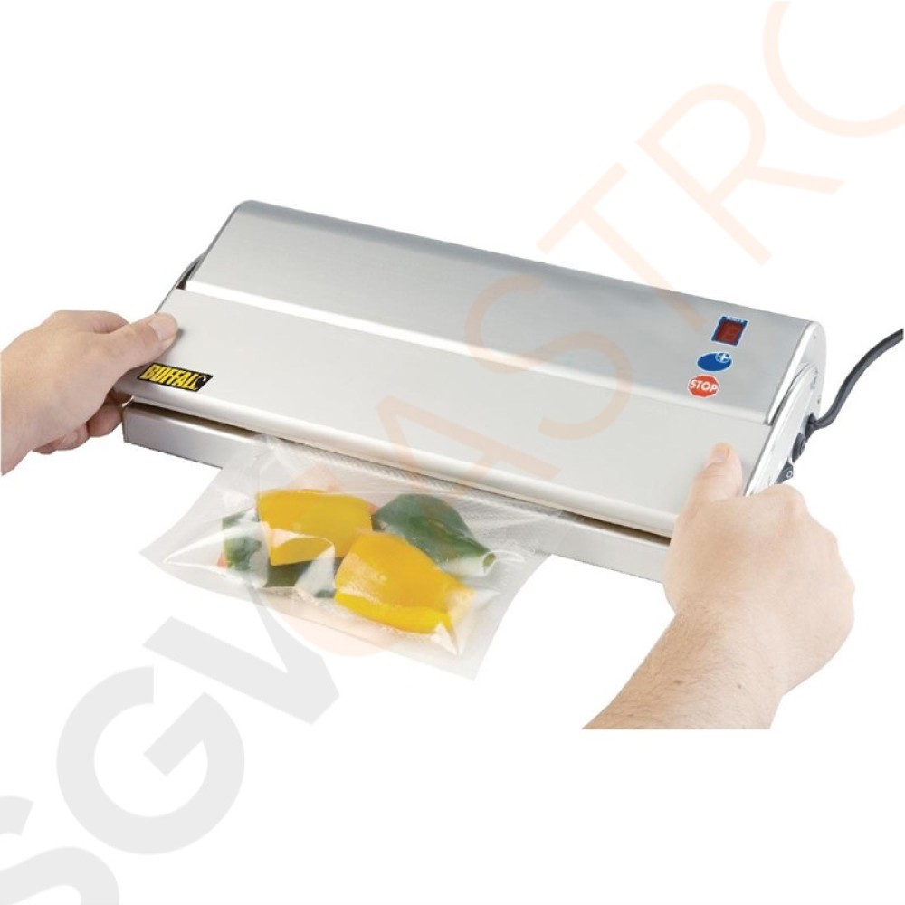 Verlängern Sie die Haltbarkeit von Nahrungsmitteln mit dieser Maschine. Sparen Sie Geld durch weniger Lebensmittelverschwendung und Zeit durch Vorbereitung. Für die Verwendung mit Beuteln bis 30cm Breite.