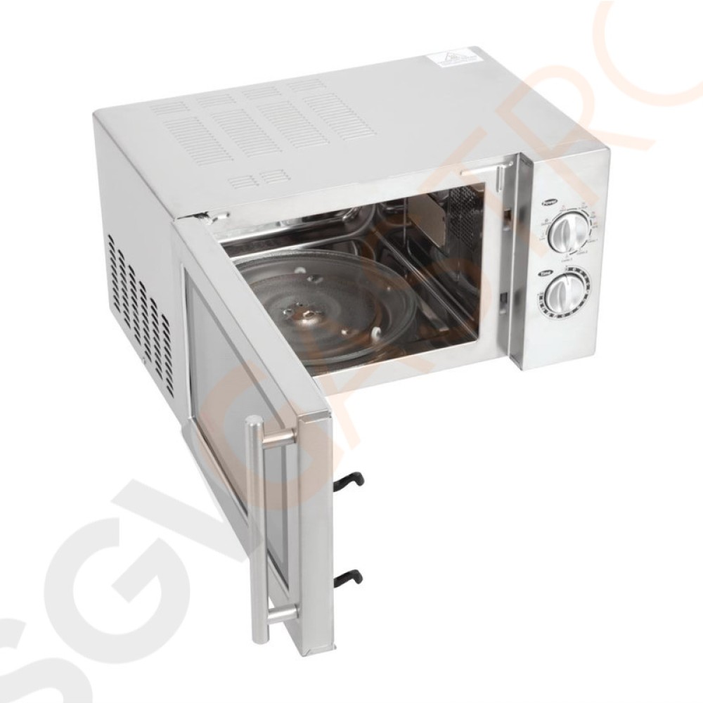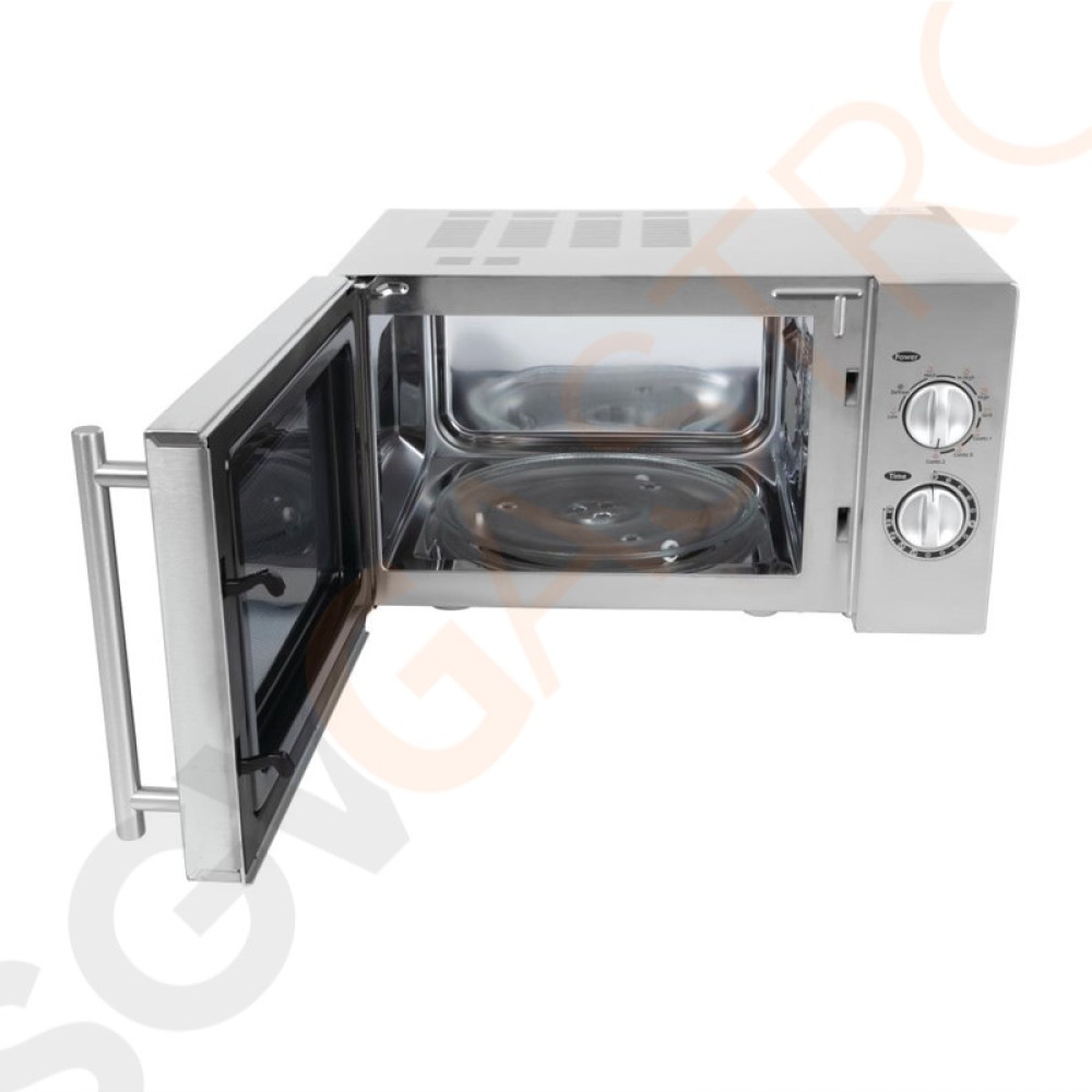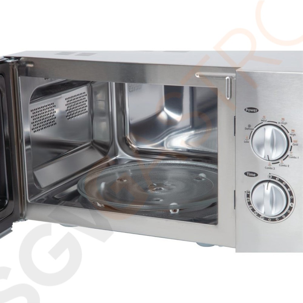 Kompakte Edelstahlmikrowelle ausgestattet mit Grillfunktion. Manuell zu bedienen und komplett mit Grillrost sowie Glasdrehteller geliefert.