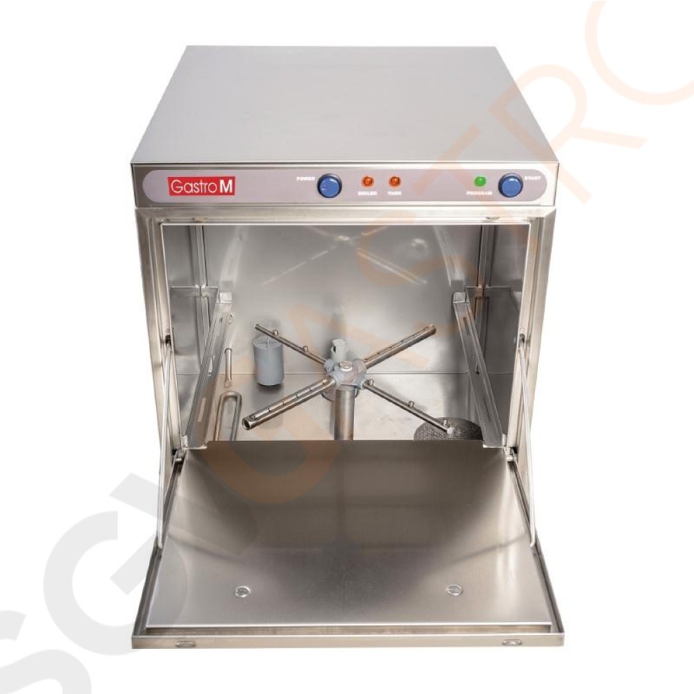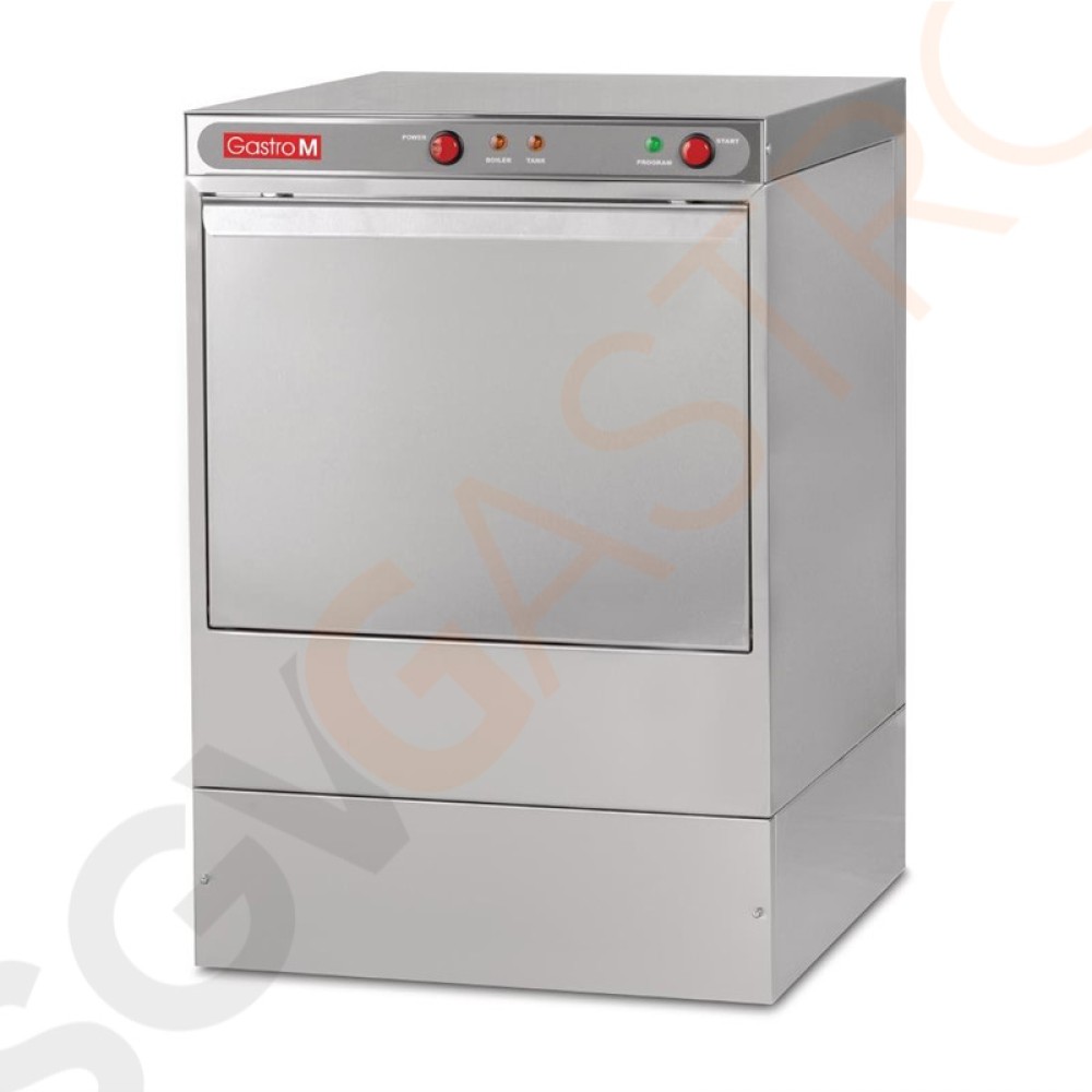 Gläserspülmaschine mit Edelstahlgehäuse AISI 304 und doppelwandiger Tür, elektromechanisch, ein Waschprogramm, tiefgezogener Waschtank, automatischer Waschgang, thermostatgeregelter Tank und Heizkessel, automatische Wasserstandsregelung. Mit Hauptschalter und Programm-/Startschalter. Herausnehmbare Spülarme aus Edelstahl zur einfachen Reinigung. Sicherheitsschalter an der Tür. Komplett mit 2 Spülkörben 40 x 40cm, Besteckbehälter, Tellerspülkorb und Klarspülerfach. Maximale Gläser- und Tellerhöhe: 29cm.