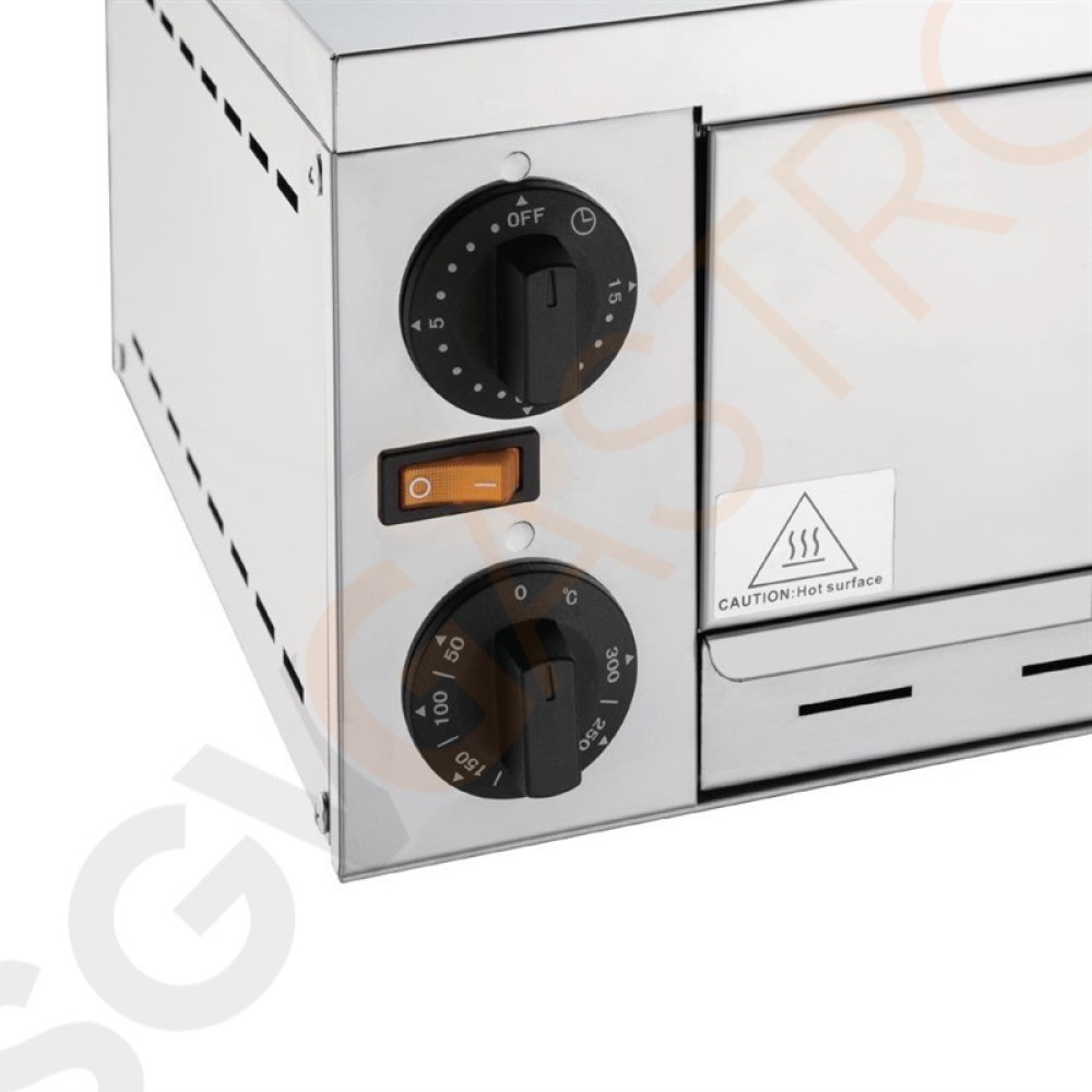 Platzsparender, kompakter Pizzaofen. Erwärmt sich schnell und ist ideal für frische und tiefgefrorene Pizzen bis 30,5cm.
