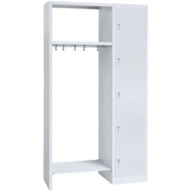 Garderobe, 1 Abteil, 5 Fächer rechts Rechts 1 Abteil mit 5 FächernJe Fach Zylinderschloss inkl. 2 SchlüsselLinks Garderobenelement mit Hutboden, Kleiderstange und SchuhrostMaße: H 1800 x B 1115 x T 500 mmKomplett verschweißt - Garderobenelement muss montiert werden..