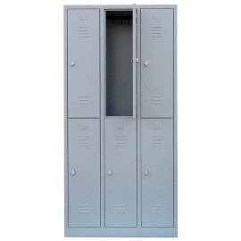 Spind lichtgrau 520230, 6 Schließfächer 88,5 x 50,0 x 180,0 cm 3 Abteile doppelstöckig = 6 FächerAbteilbreite ca. 295 mmJe Fach Kleiderstange mit 3 KleiderhakenJe Fach Drehriegelverschluss für VorhangschlossMaße: H 1800 x B 885 x T 500 mmKomplett montiert und verschweißt - sofort einsatzber..