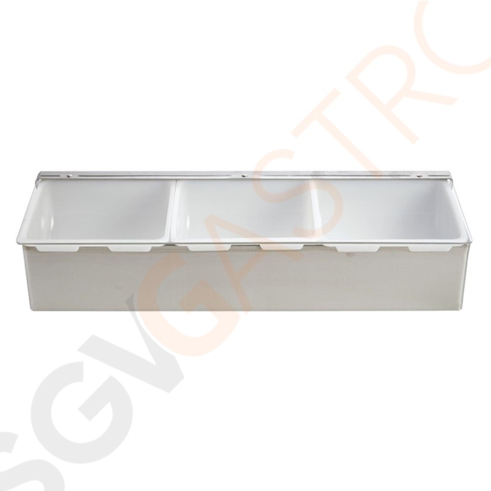 Olympia Beilagenbehälter 3 Fächer 7,6(H) x 46(B) x 15,2(L)cm | 3 herausnehmbare Behälter | Gesamtkapazität: ca. 2,8L | Edelstahl  Olympia Beilagenbehälter 3 Fächer 7,6(H) x 46(B) x 15,2(L)cm | 3 herausnehmbare Behälter | Gesamtkapazität: ca. 2,8L | Edelstahl