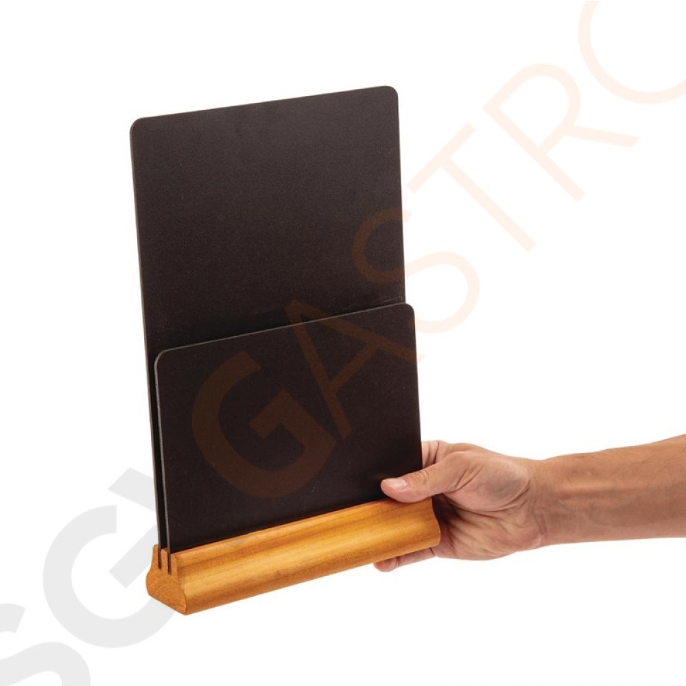 Doppelseitige Tafel im Menühalter zum Beschriften mit Angeboten oder Tischnummern. Geeignet für den Einsatz mit Kreidestiften.