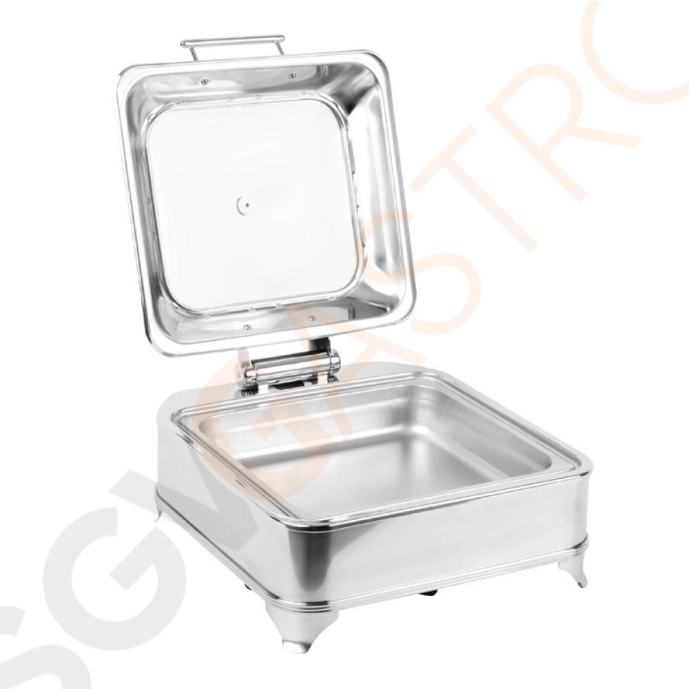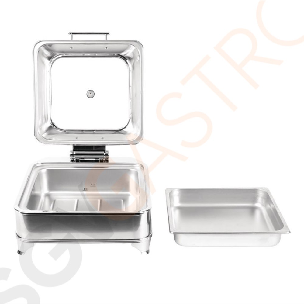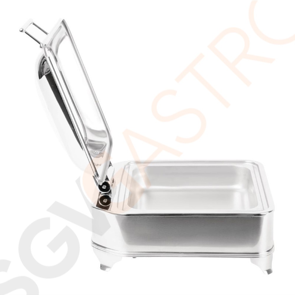 Attraktive Speisenpräsentationsmethode - ideal für Buffets. Topqualität aus Edelstahl mit Glasabschnitten im Deckel, damit die Speisen auch mit einem Deckel sichtbar sind. Sicherer als herkömmliche Chafing-Dishes, da das Gerät ohne offene Flamme oder teure Brennpasten betrieben wird. Hydraulischer Deckel mit Öffnungs- und Schließsystem bietet eine verbesserte Sicherheit und einfachere Nutzung. Feuchter Hitzebetrieb. Geliefert mit Behälter, Ersatzbehälter separat erhältlich.
