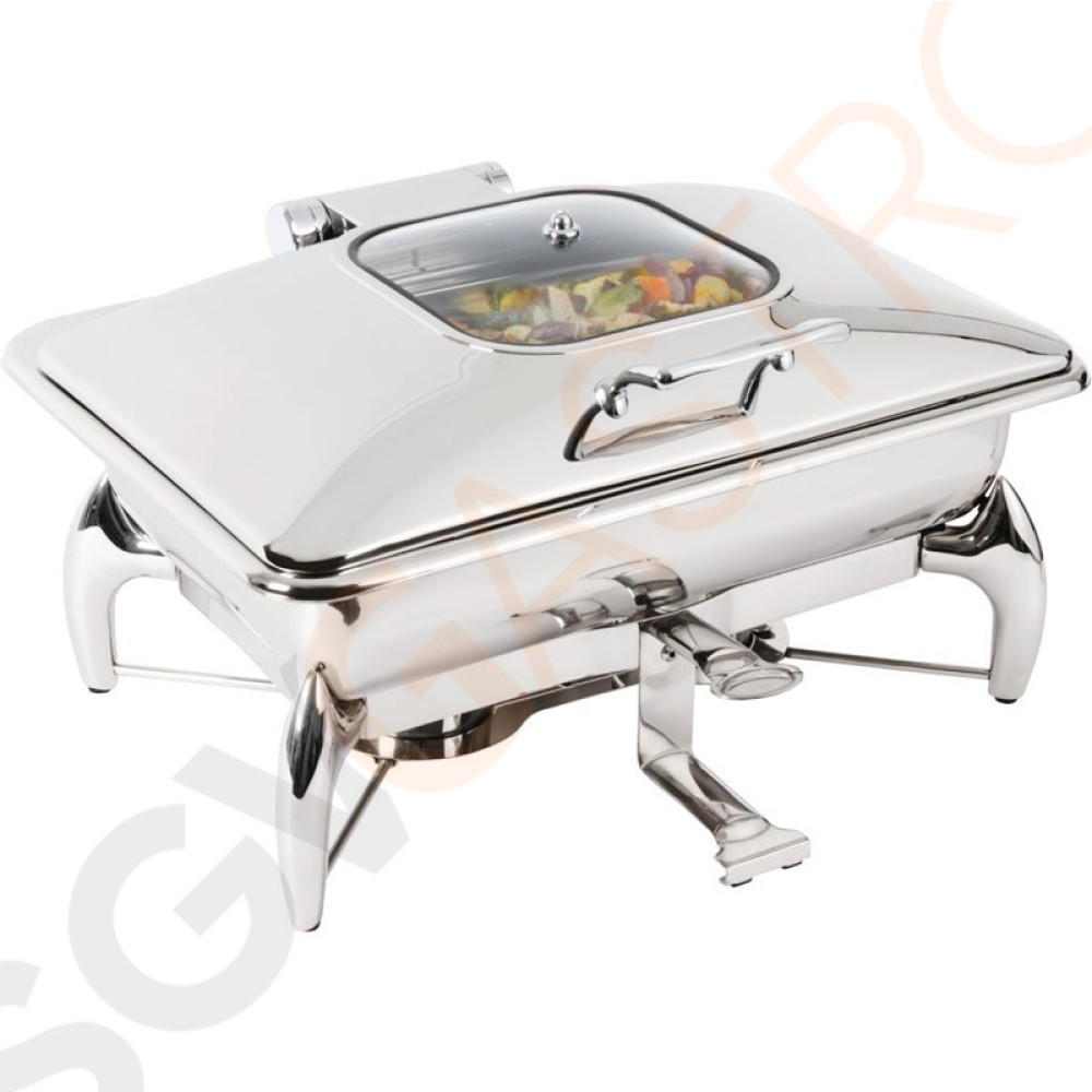 Chafing-Dish aus Edelstahl der direkt auf Induktionsplatten erwärmt werden kann. Auch als traditioneller Chafing-Dish zu gebrauchen. Sie benötigen hierfür ein Gestell und ein Induktionsheizelement (GD300, nur geeignet für Chafing-Dish GD155) separat erhältlich. Ausgestattet mit Glasdeckel. Hydraulischer Deckel, der auf 60º stehen kann. Das Kondenswasserrückfuhrsystem sorgt dafür, dass das Kondenswasser automatisch in den Wasserbehälter und nicht in den Speisebehälter zurückgeführt wird.
