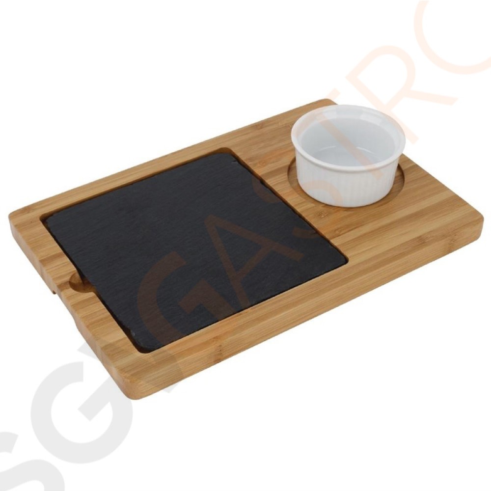 Bambusbasis für Schieferplatte, mit 7cm Aussparung für Förmchen. Ideal zum Servieren von kleinen Gerichten mit Soßen oder Dips am Rand.
