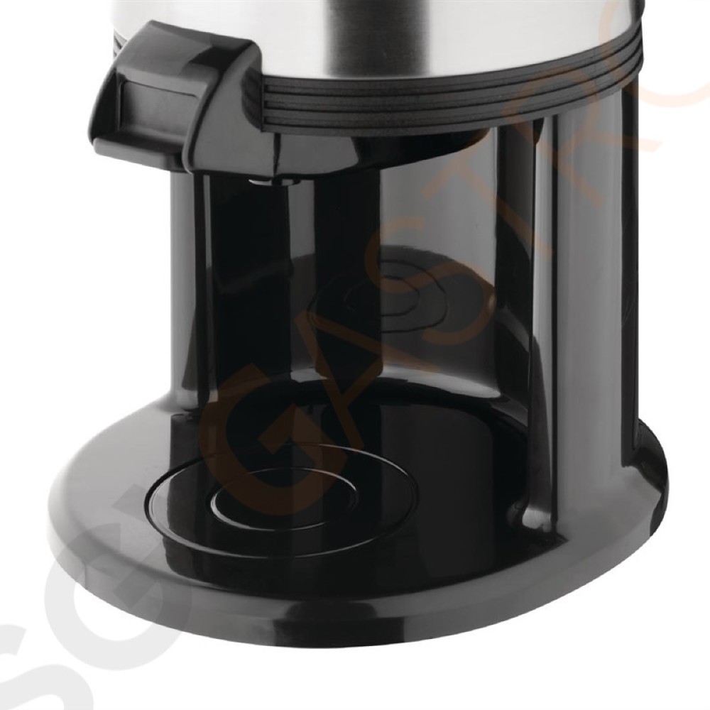 Getränkespender mit Edelstahlgehäuse und Kunststoffdeckel, -griff und -becherstation. Geeignet für heiße und kalte Getränke.