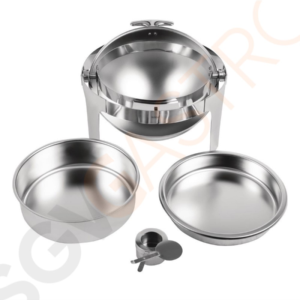 Polierter runder 18/8 Edelstahl-Chafing-Dish mit Rolldeckel und Wasser- und Speisenbehälter, Deckel und Brennpastenbehälter. 45 x 52 x 48cm.