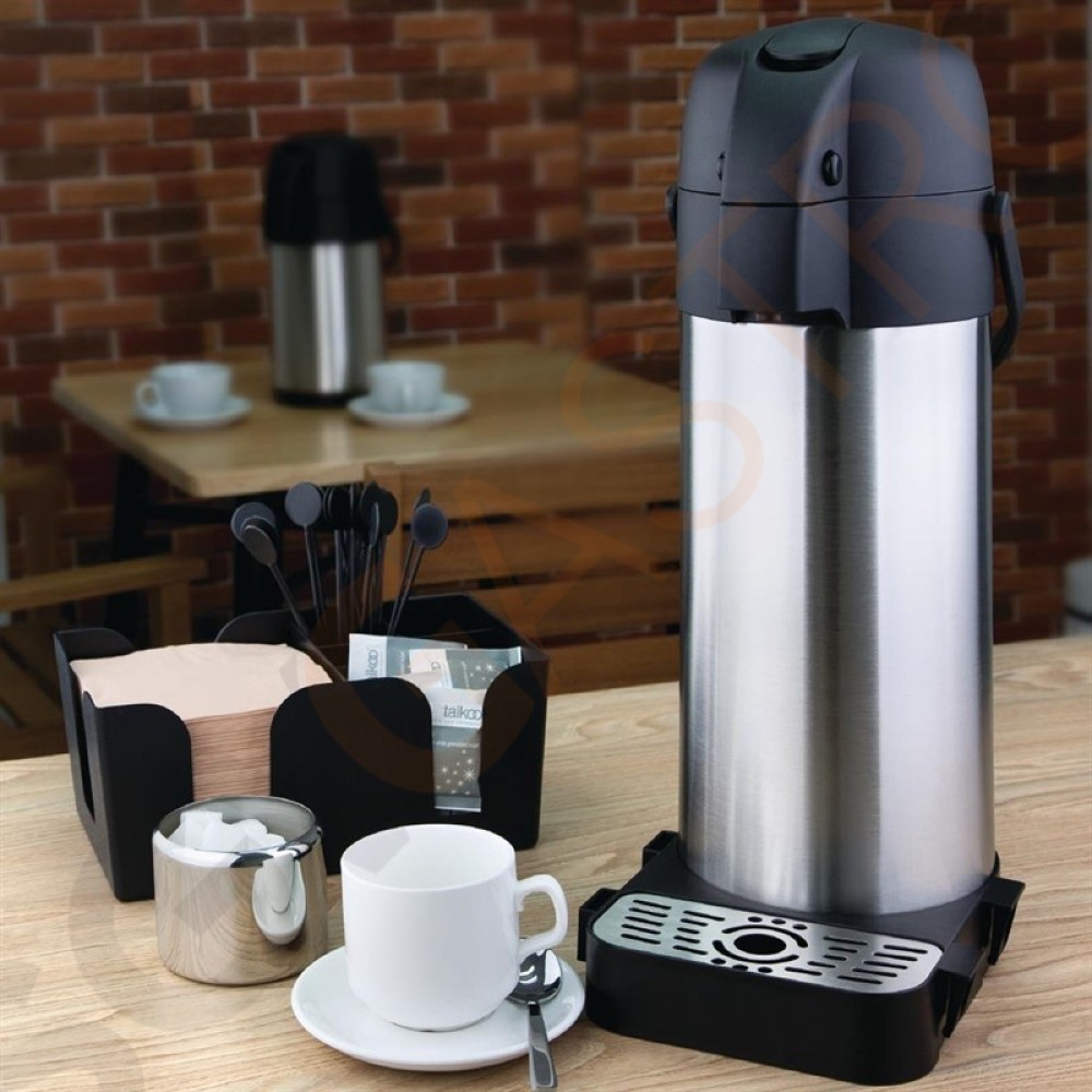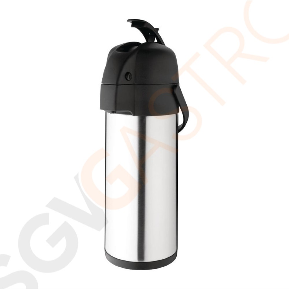 Doppelwandige Pumpkanne aus Edelstahl mit abnehmbarem Deckel und weiter Öffnung für einfache Reinigung.
