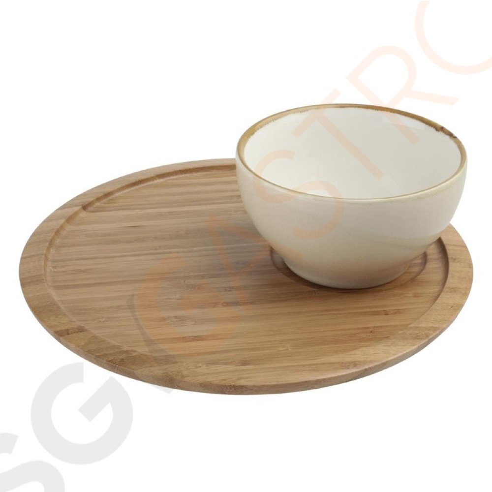 Rundes Präsentierbrett aus Bambus mit einer 10(Ø)cm-Aussparung. Passend für Suppentasse DC398, Olympia Kiln-Schale GP460, GP463, GP466 und GP469, oder Teekanne GM593, GM594, GM595 und GM596.