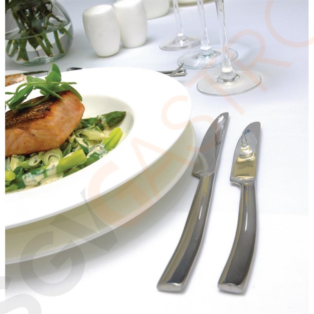 Unverwechselbares modernes Dekor mit subtil geschwungenem Griff. Langlebig geschmiedeter hochglanzpolierter 18/10 Edelstahl. Im 12er Pack.