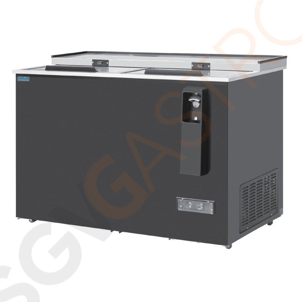 Erstklassige Toplader Flaschenkühler mit Schiebedeckel. Mit eingebautem Flaschenöffner und Kappenbehälter.