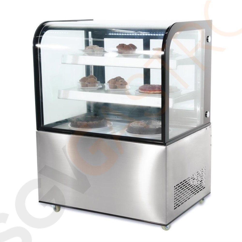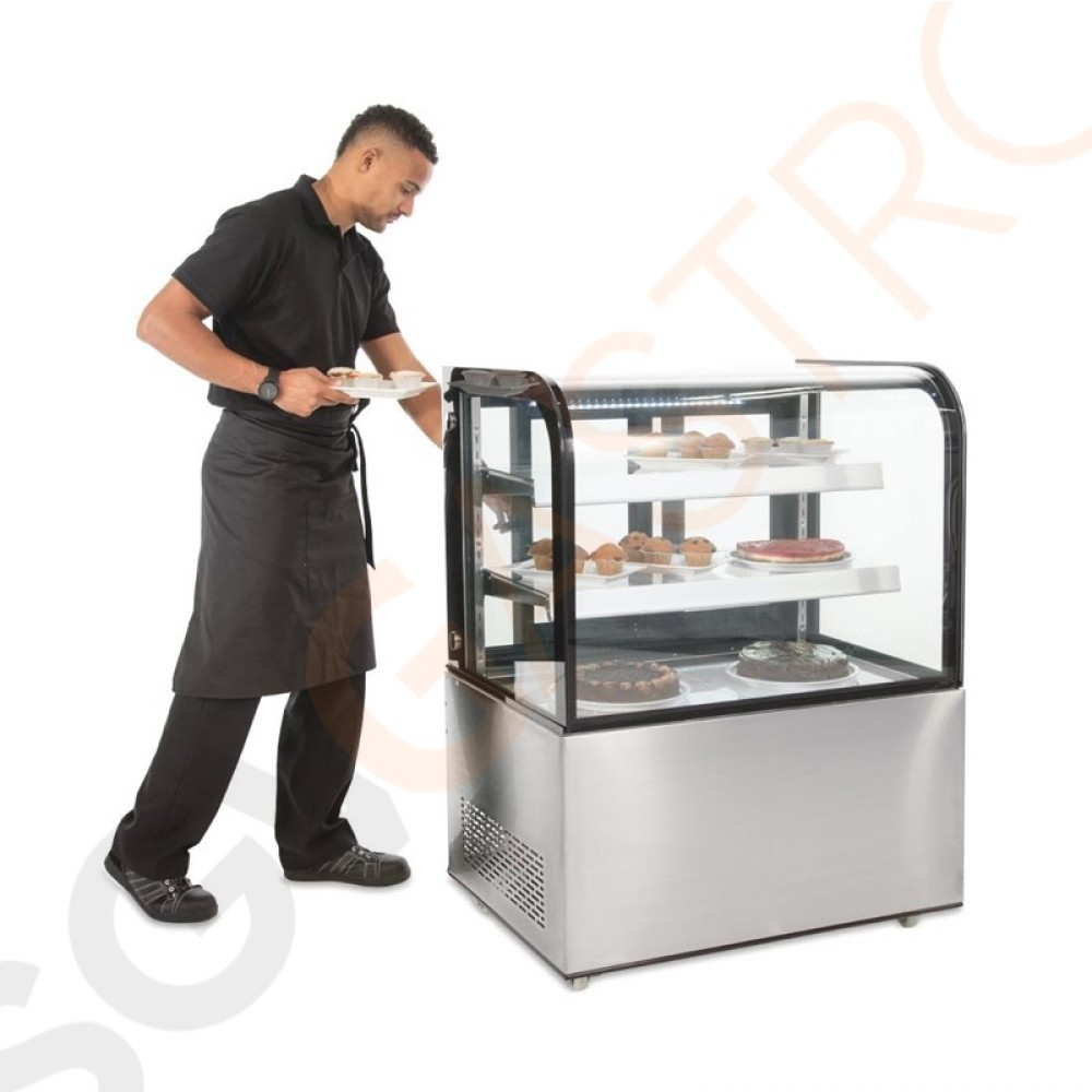 Attraktive Glasvitrine ideal zum Präsentieren von Torten, Gebäck und anderen frischen Produkten. Schiebetüren an der Rückseite für den einfachen Zugang. Zwangsbelüftung und automatische Abtauung.