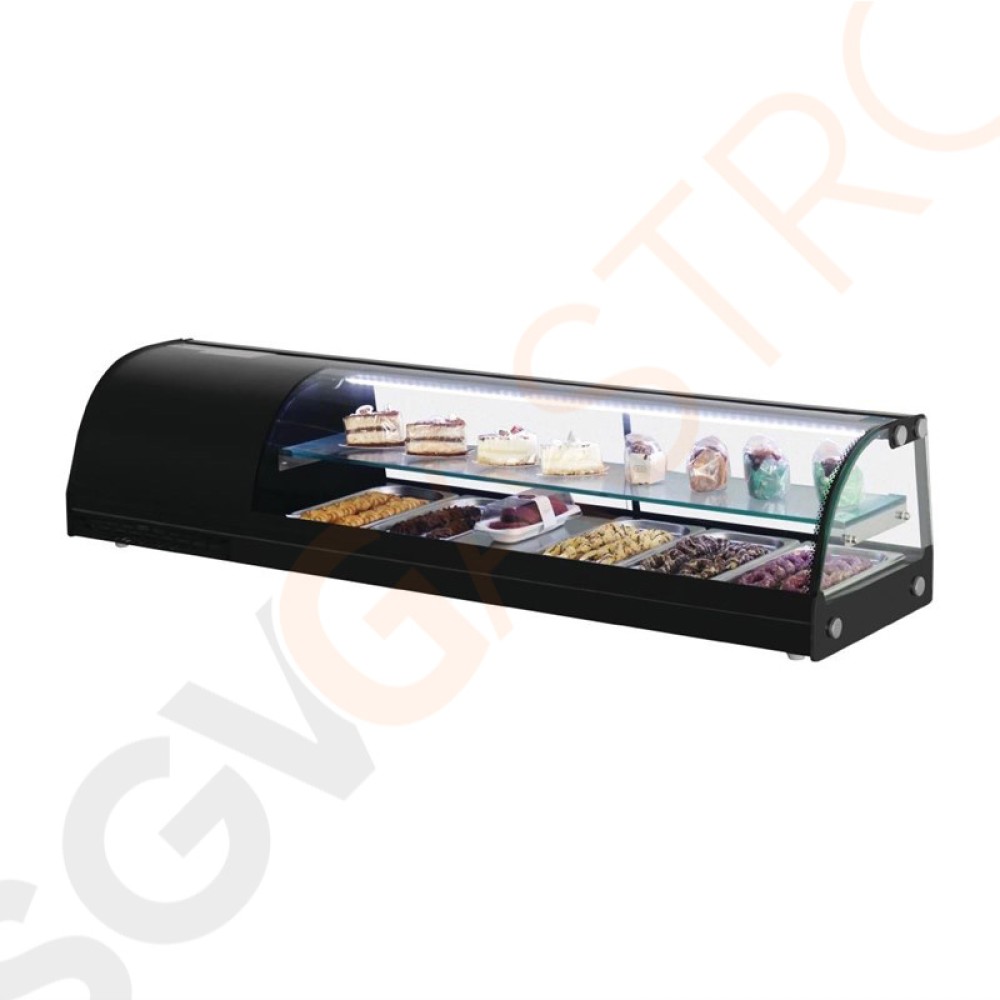 Diese praktischen Kühlvitrinen helfen Ihnen, Tapas, Salate, Nachspeisen und vieles mehr frisch zu halten. Die LED-Innenbeleuchtung bringt Ihre Gerichte bestens zur Geltung. Digitales Bedienfeld und automatische Abtauung. Kompatibel mit GN-Maßen.