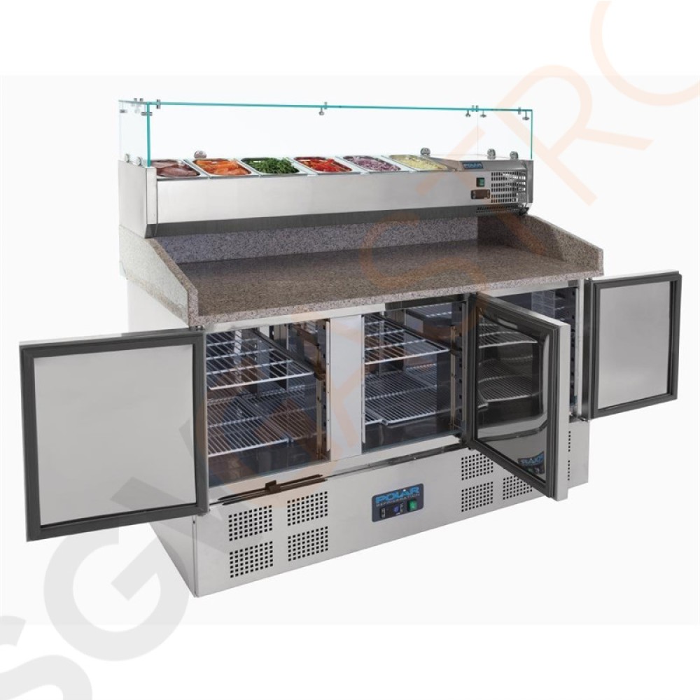 Polar Serie G Thekenkühltisch für Pizzen und Salate 368L - Edelstahloberfläche mit Marmorplatte | Gastronorm-kompatibel | 3 Türen