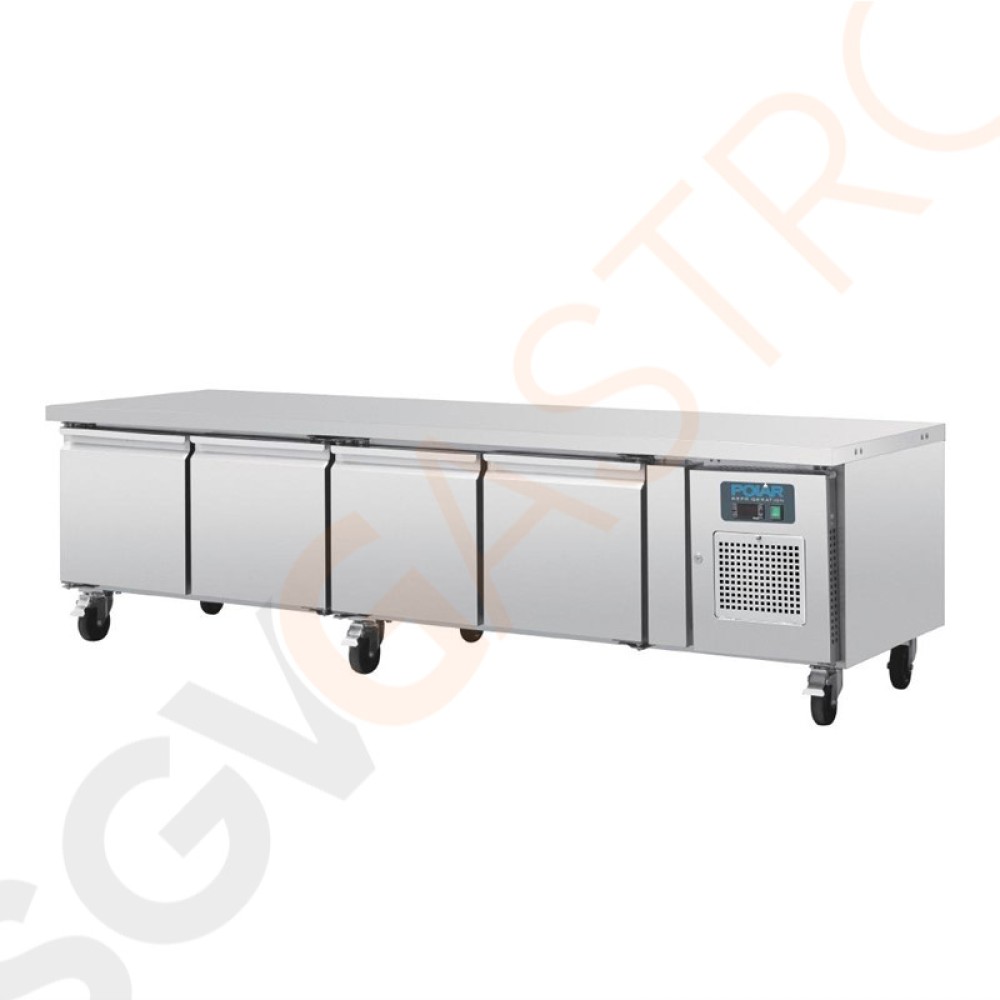 Stichworte: Polar Serie U 4-türiger GN-Kühltisch 420L 230V | 65 x 223 x 70cm | (Nutz)Kapazität: 420L/262L | 4 Türen