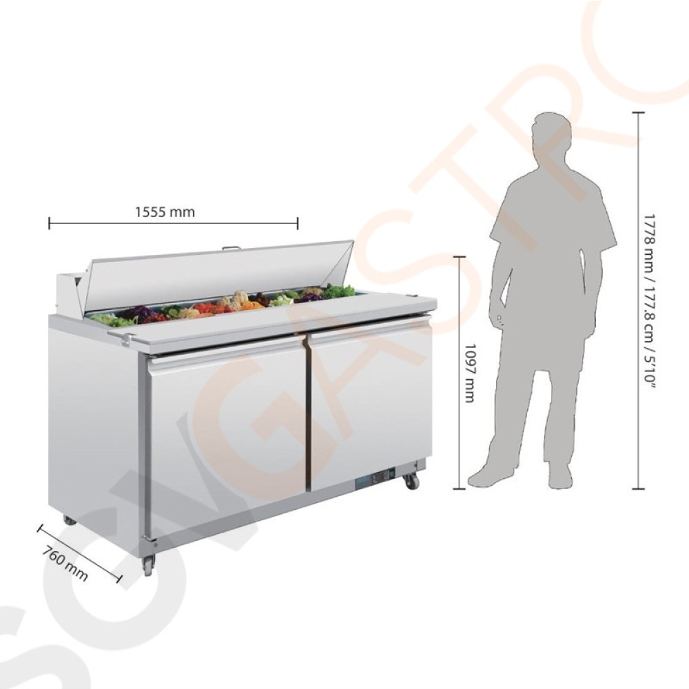 Gekühlte Saladette mit GN-Lagerraum. Edelstahlaussenseite und isoliertem Edelstahldeckel. Vollautomatischer Regler und digitaler Anzeige. Komplett geliefert mit zwei Tragerosten (42,5x54cm).