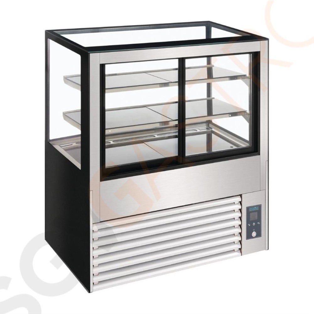 Attraktive Kühlvitrine für die Präsentation von Torten, Gebäck, Brot etc. Innovative Funktionen verhindern Eisbildung und Kondensation. Belüftete Kühlung mit Schiebetüren auf der Rückseite ermöglichen einen einfachen Zugriff.