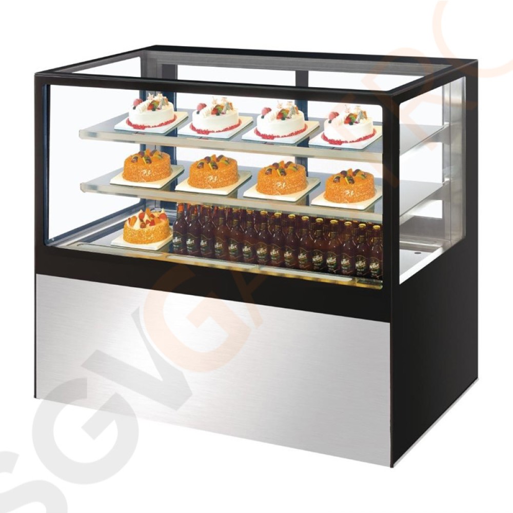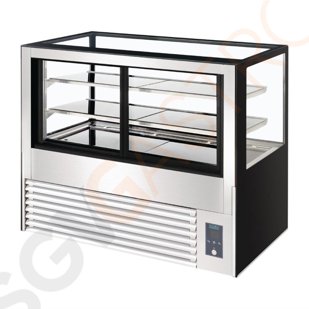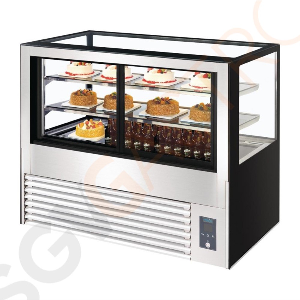 Attraktive Kühlvitrine für die Präsentation von Torten, Gebäck, Brot etc. Innovative Funktionen verhindern Eisbildung und Kondensation. Belüftete Kühlung mit Schiebetüren auf der Rückseite ermöglichen einen einfachen Zugriff.