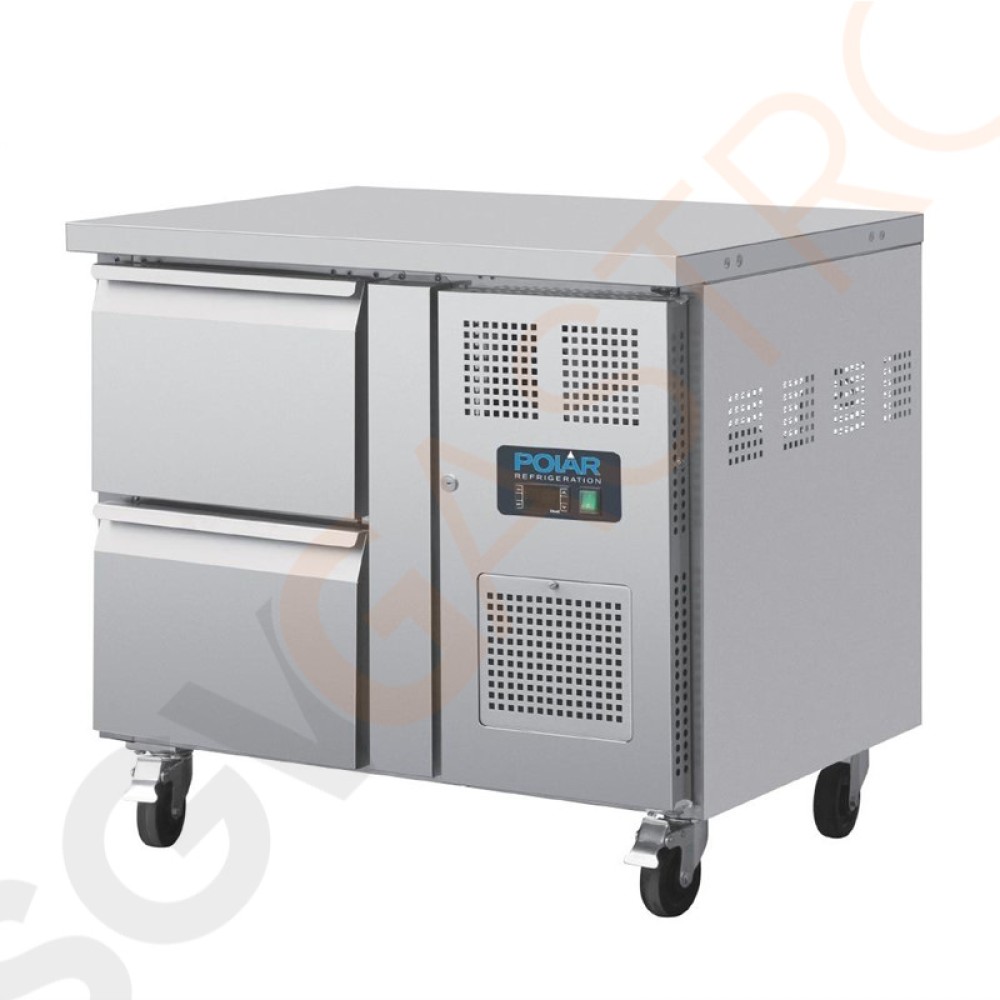 Stichworte: Polar Serie U GN-Kühltisch mit 2 Schubladen 124L 230V | Arbeitsfläche: 92, 5 x 70cm | (Nutz)Kapazität: 124L/59L | 2 Schubladen