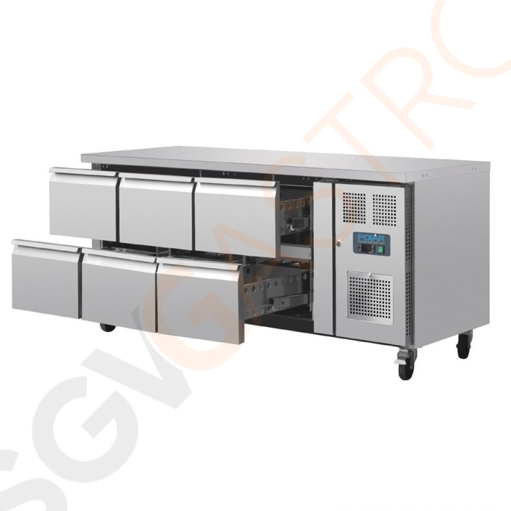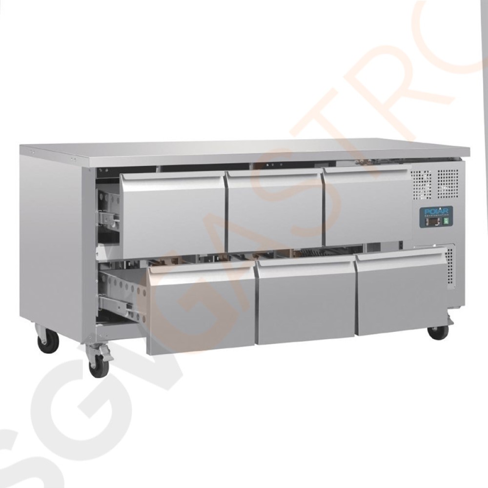 Stichworte: Polar Serie U GN-Kühltisch mit 6 Schubladen 465L 230V | Arbeitsfläche: 179, 5 x 70cm | (Nutz)Kapazität: 465L/275L | 6 Schubladen