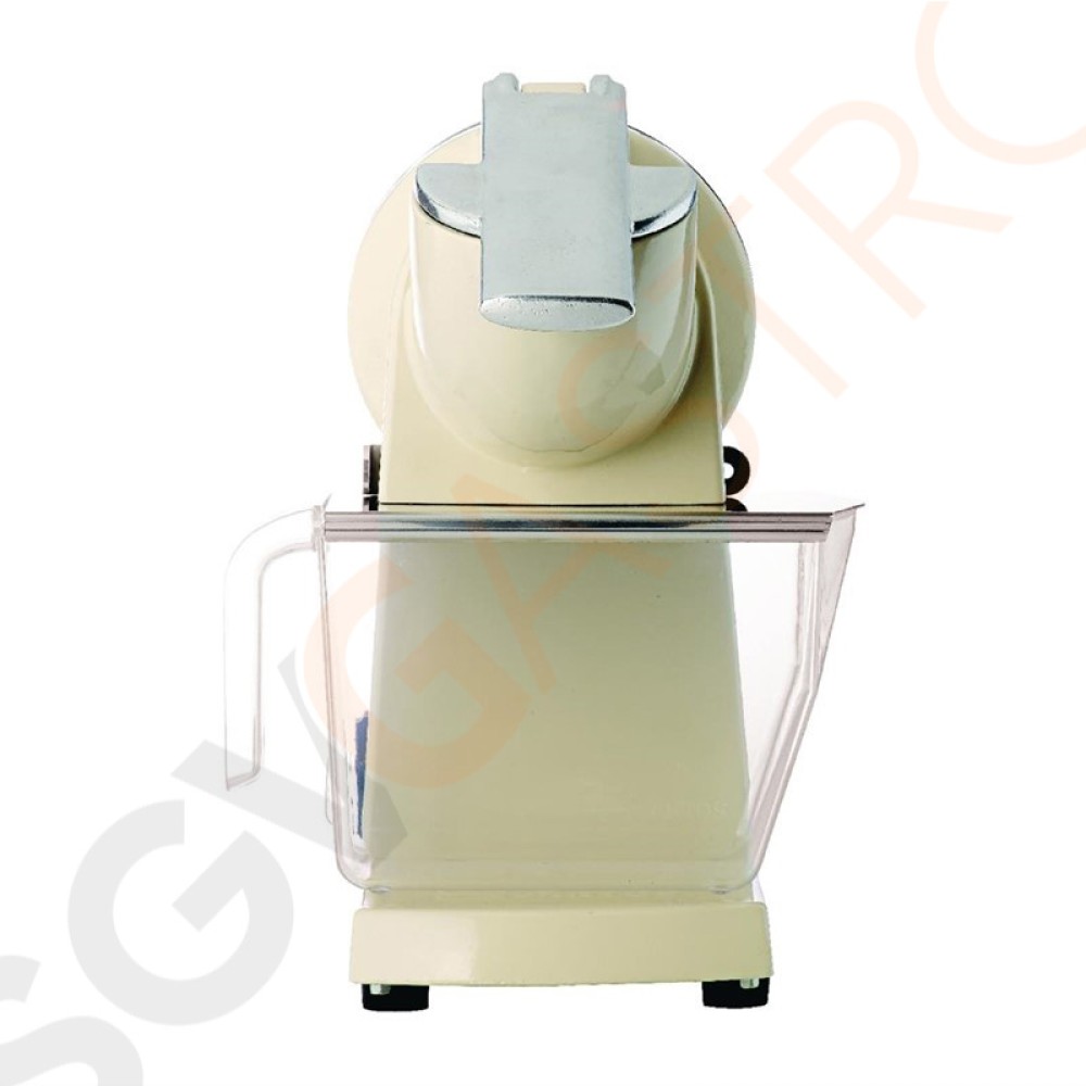 Leistungsstarke elektrische Reibe mit leisem Motor und Sicherheitsschalter, geeignet für Nüsse, Trockenfrüchte, Schokolade und Käse. Einfach zu reinigendes Gehäuse mit abnehmbaren Teilen, die geschirrspülergeeignet sind. Ideal für Supermärkte, Pizzerien und Konditoreien.