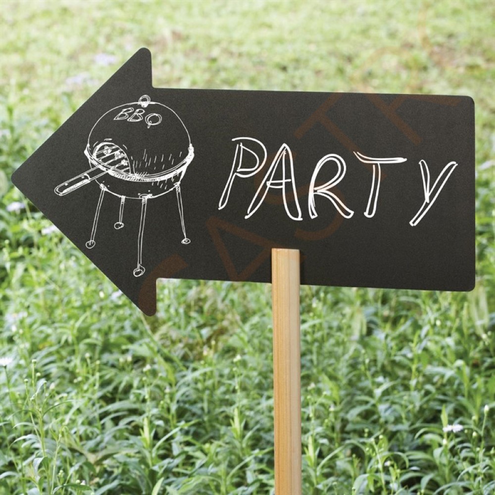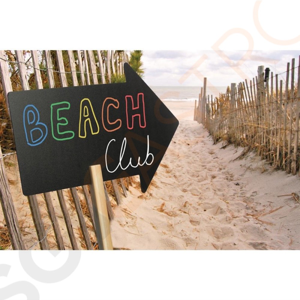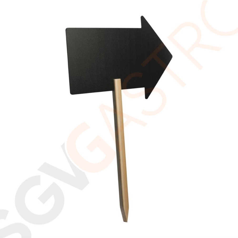 Diese originelle Tafel in Pfeilform lässt sich mithilfe ihres angespitzten Holzstiels praktisch in Rasenflächen oder Blumentöpfen aufstellen, um Ihren Kunden die Richtung zu Ihrem Betrieb zu zeigen. Inklusive flüssiger Kreidestift.