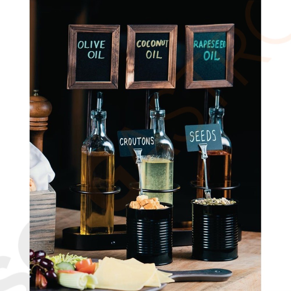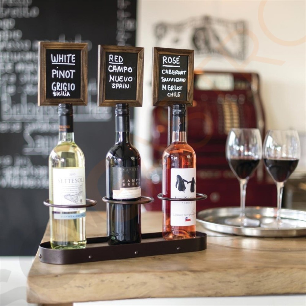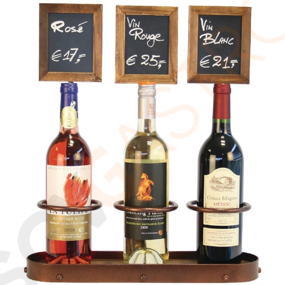 Robuste, eiserne Weinflaschenhalter mit Kreidetafel für Preisinformationen. Flaschenring 9(Ø)cm. Kreidetafel 13 x 10,5cm.