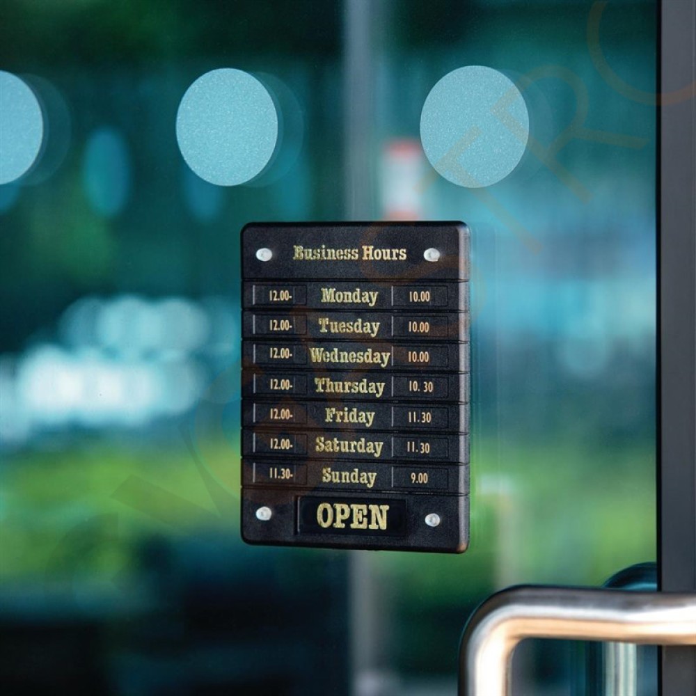 Open/Closed Türschild mit Wochentagen und einstellbaren Zeiten. Schwarzer Kunststoff mit goldenem Schriftzug. 20(H) x 16(B) cm.