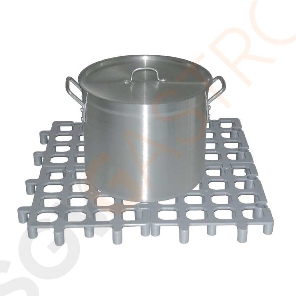 Quadratischer Bodensteg aus Polypropylen mit Löchern für Luftzirkulation. Geeignet für Räume, in denen Waren auf dem Boden gelagert werden müssen. Einfach ineinander zu klicken und zu reinigen.