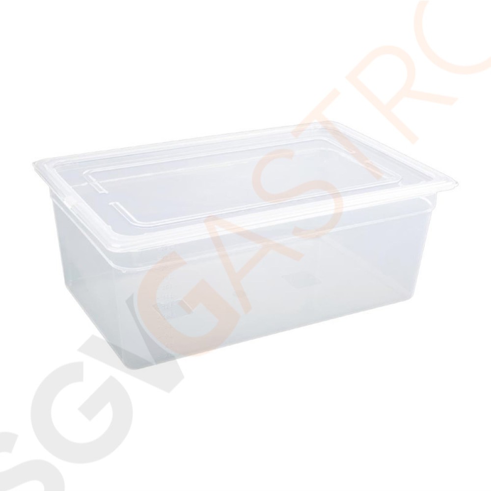 Stichworte: Vogue Polypropylen GN-Behälter GN1/1 200mm 200mm tief. Mit Deckel. Kapazitat: 25, 6Liter