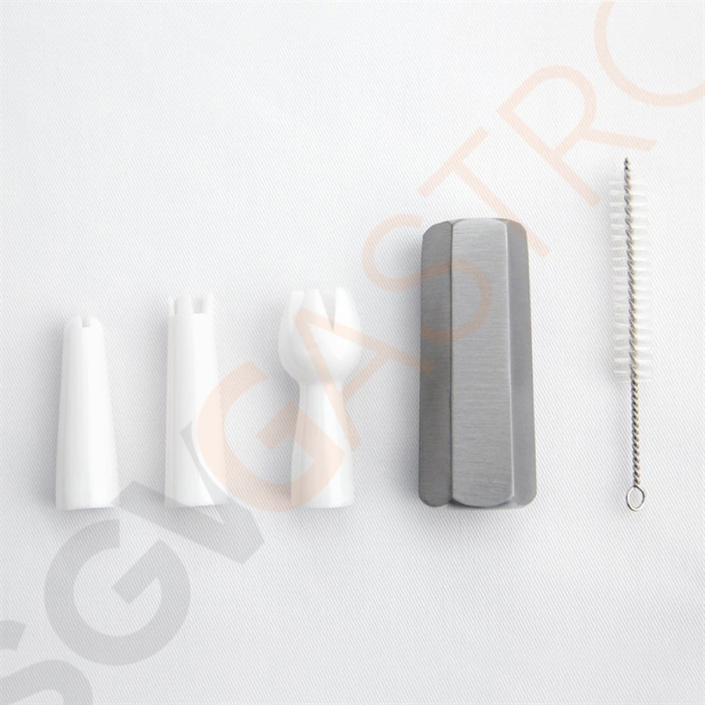 Schlagsahnesprüher und 3 Spritztüllen für eine Vielzahl von dekorativen Effekten mit Schlagsahne oder Soßen. Vollmetallflasche und Kopf für Haltbarkeit.