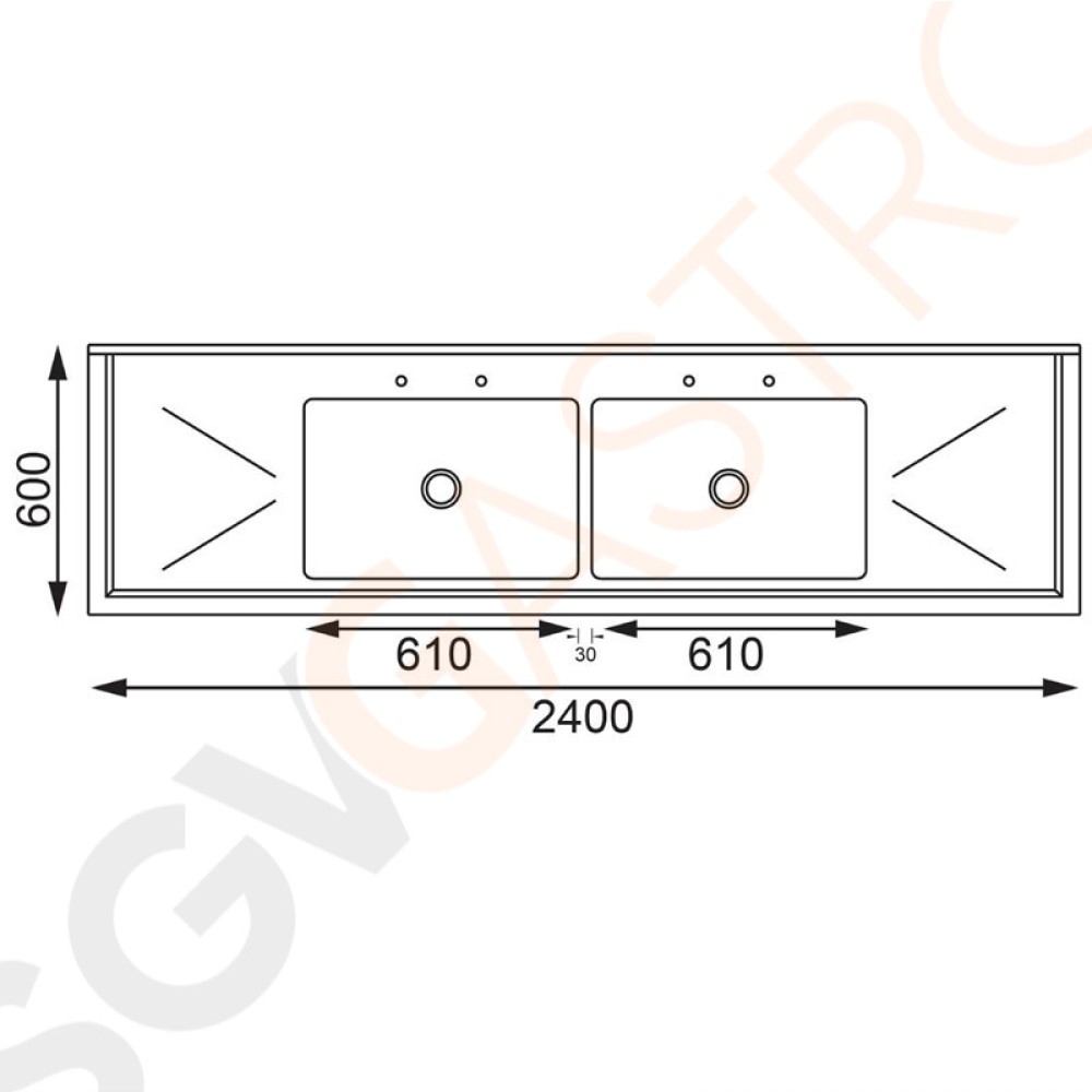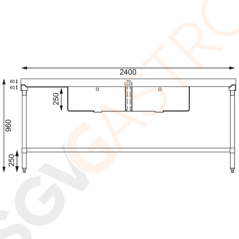 Vogue Spültisch Doppelbecken in der Mitte 240cm lang - Geeignet für Armatur Y770 | mit Aufkantung und Regalboden | Edelstahl | 90 x 240 x 60cm | 2 Becken in der Mitte