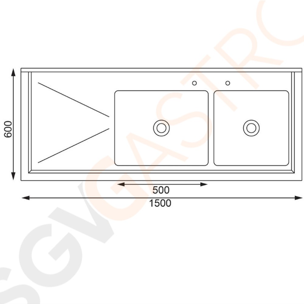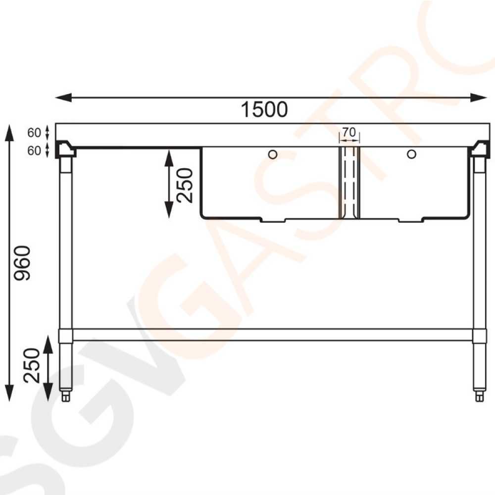 Stichworte: Vogue Spültisch Doppelbecken rechts 150cm lang Geeignet für Armatur Y770 | mit Aufkantung und Regalboden | Edelstahl | 90 x 150 x 60cm | 2 Becken rechts