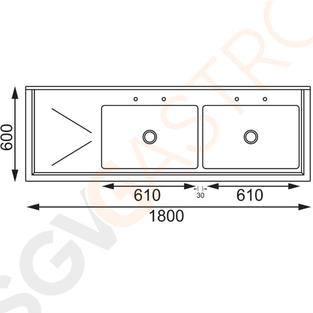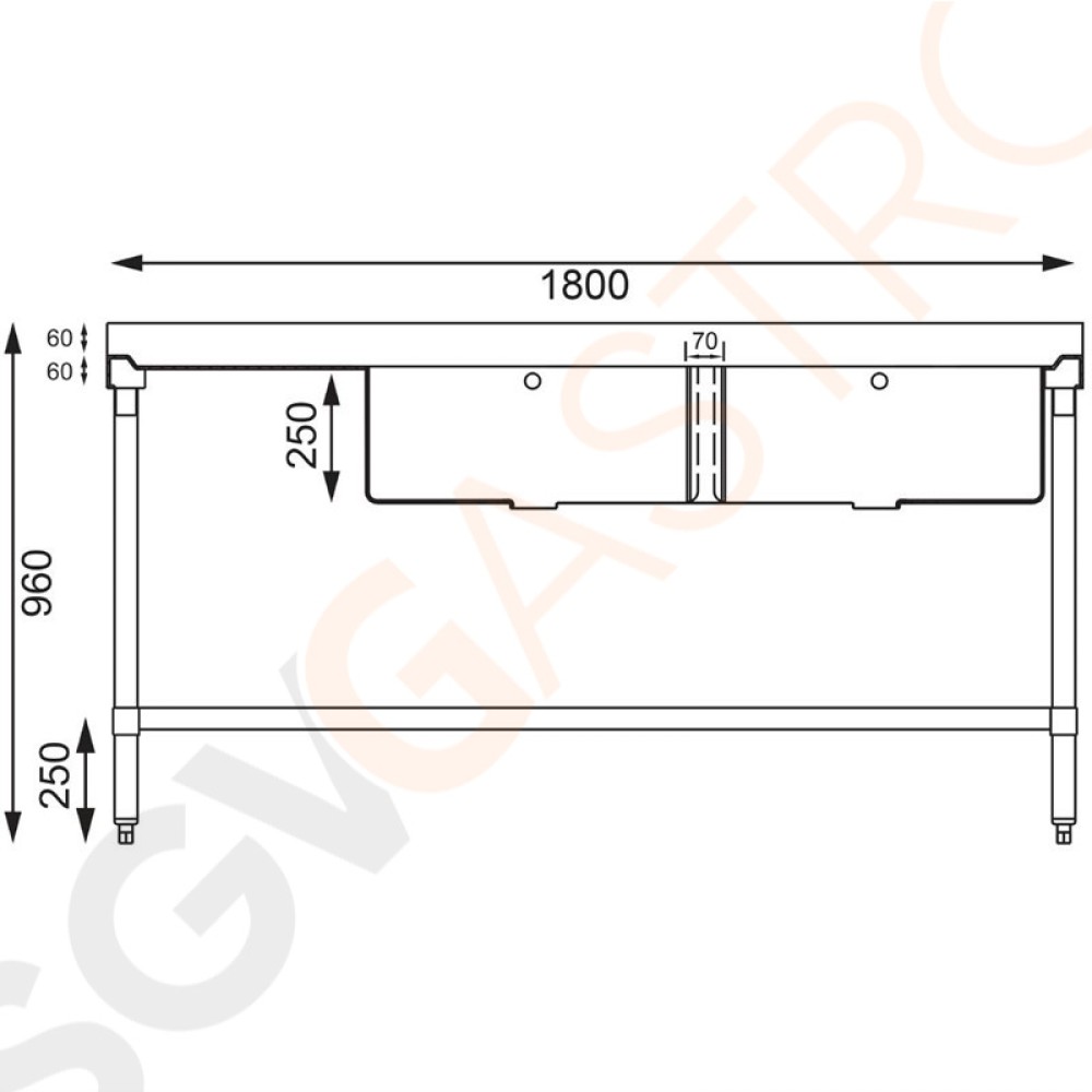 Stichworte: Vogue Spültisch Doppelbecken rechts 180cm lang Geeignet für Armatur Y770 | mit Aufkantung und Regalboden | Edelstahl | 90 x 180 x 60cm | 2 Becken rechts