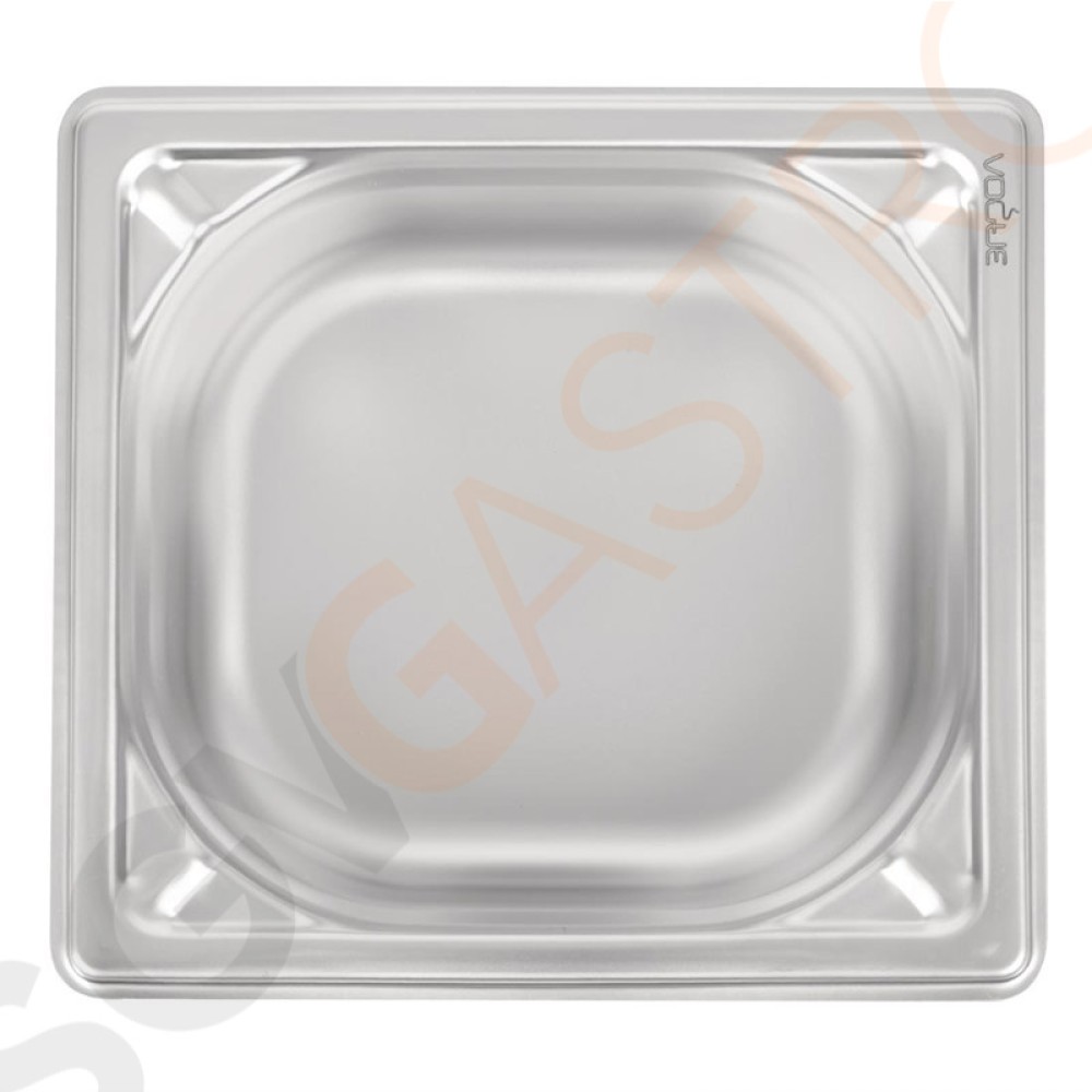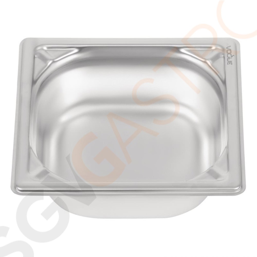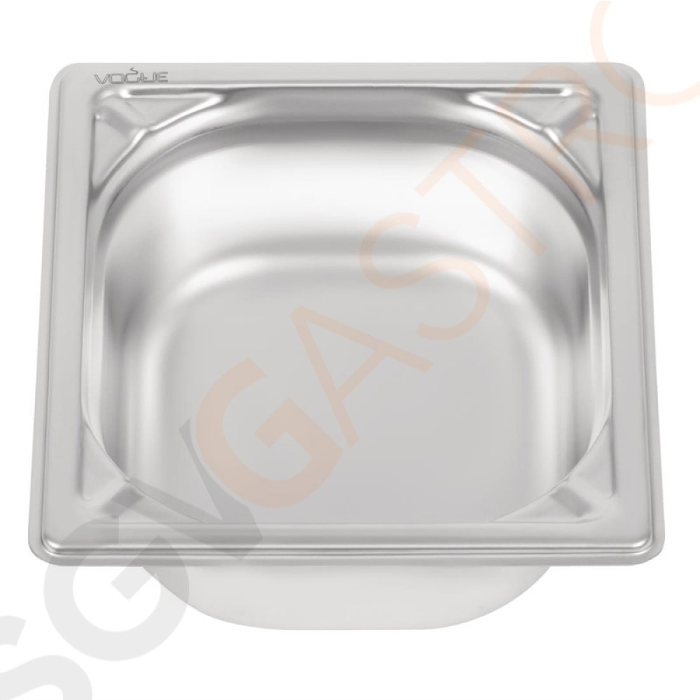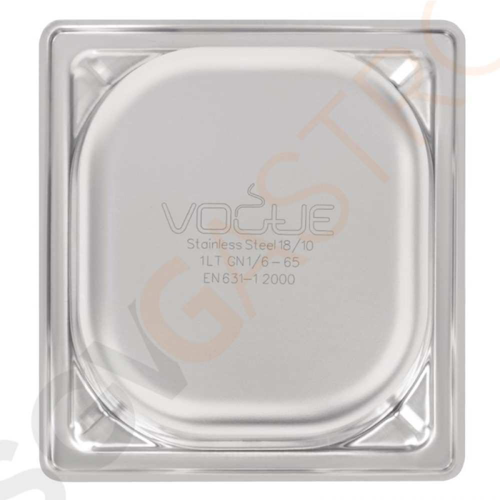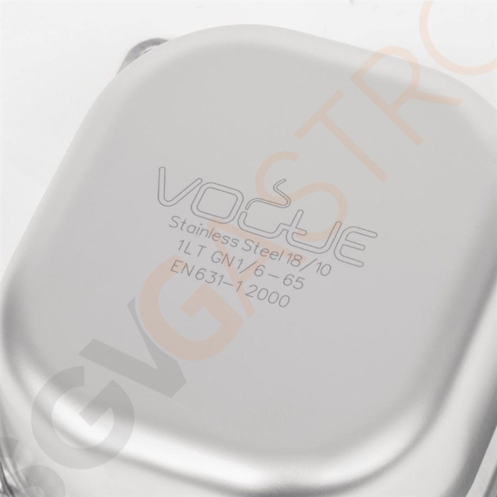 Stichworte: Vogue Strapazierfähiger GN-Behälter 1/6 Edelstahl 65mm Fassungsvermögen: 1L | GN 1/6 | Tiefe: 65mm