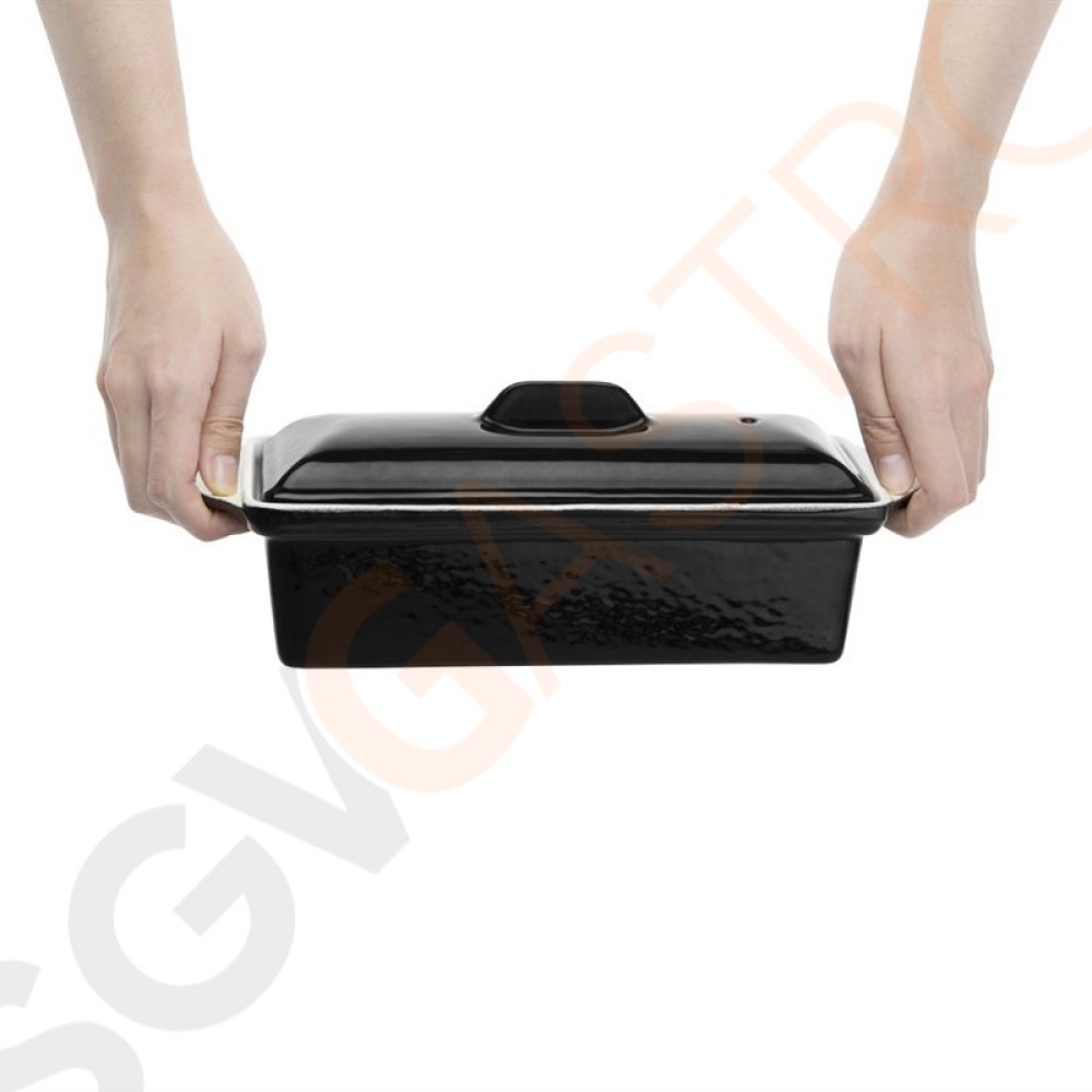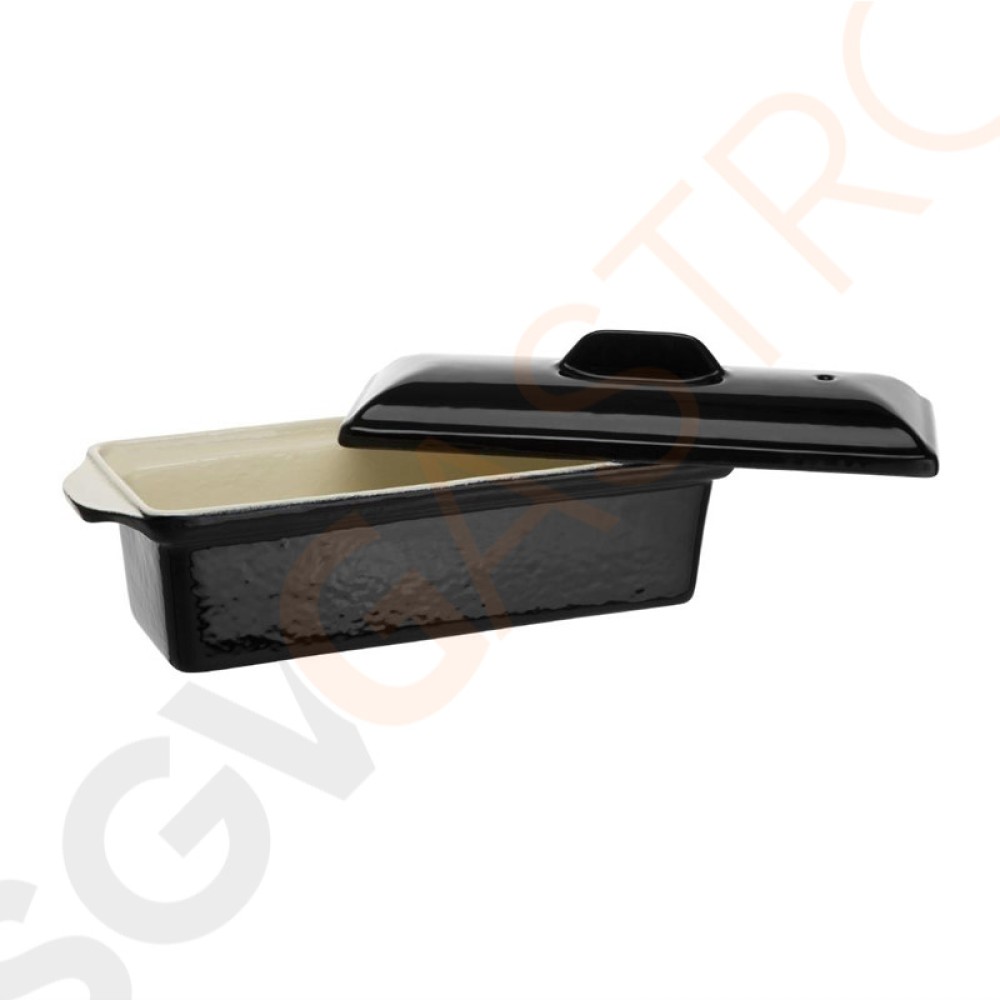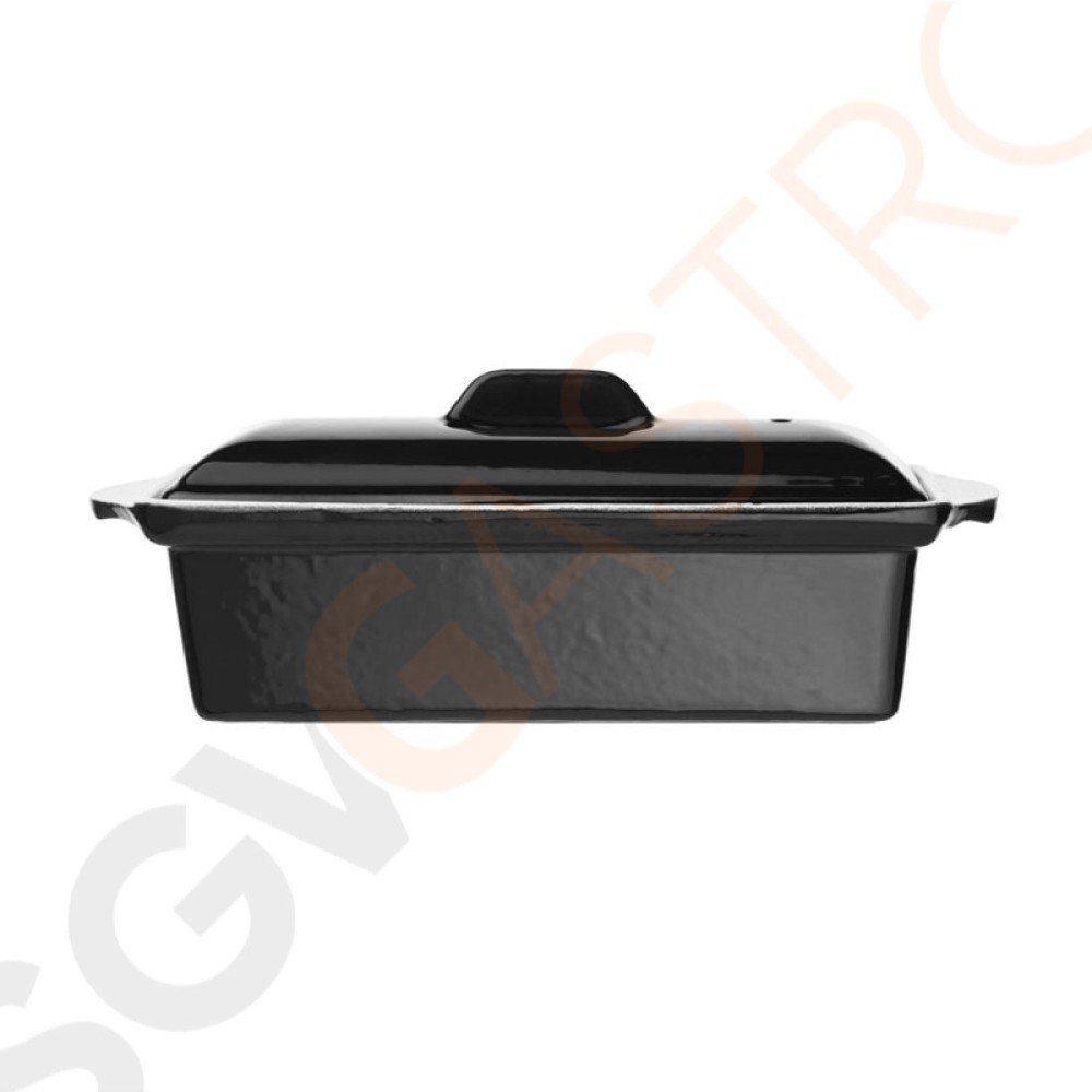 Stichworte: Vogue Terrinenform Gusseisen schwarz 1, 3L Größe: 90(H) x 310(B) x 100(T). Material: Gusseisen. Induktionsgeeignet.