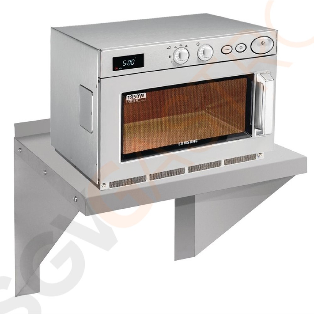 Robustes Ofen-/Mikrowellenregal aus Edelstahl. Einfach zu reinigen und komplett geliefert mit Montagematerial. Einfache Selbstmontage.