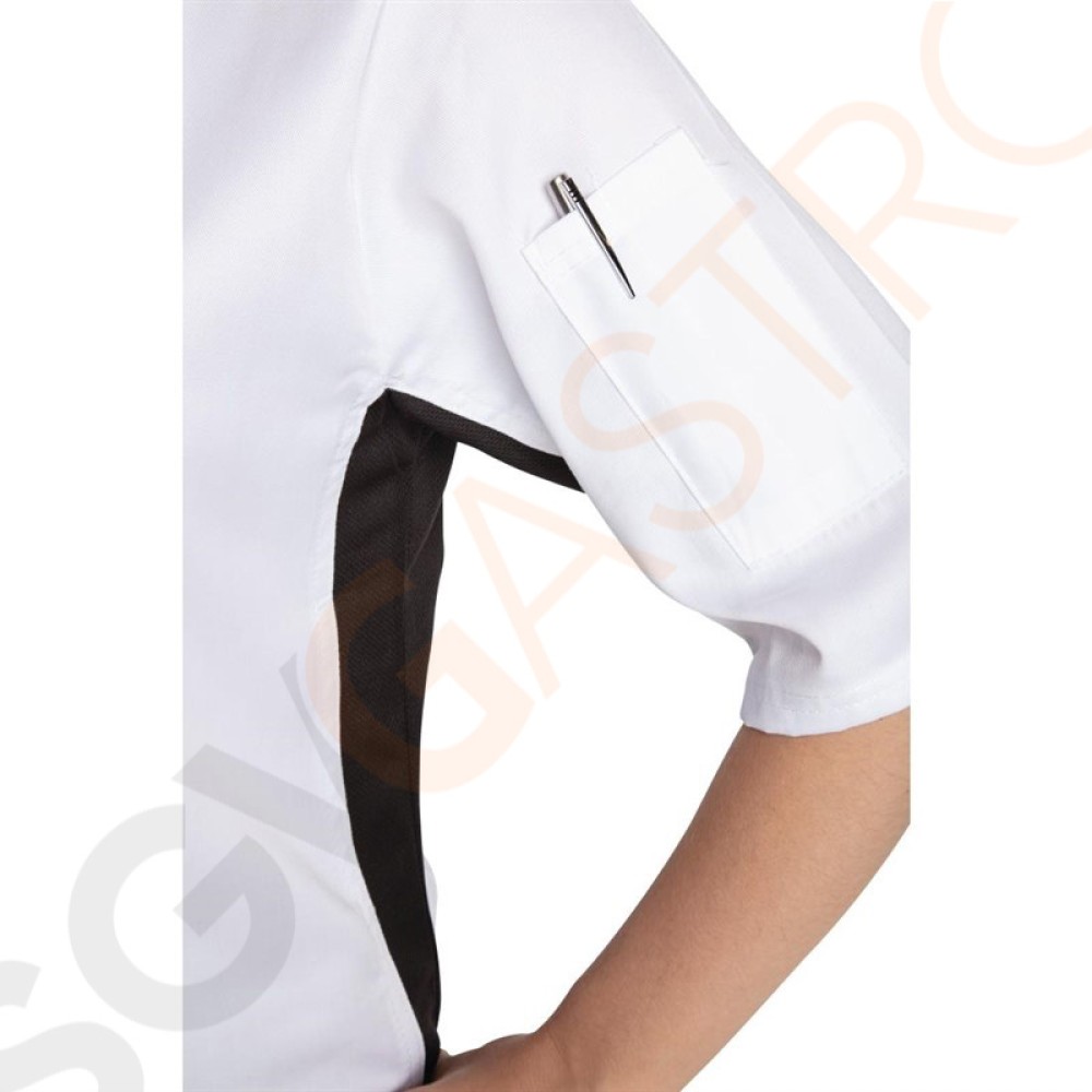 Leichtgewichtige Kochjacke mit kurzen Ärmeln und modernen schwarzen Kontrastdetails. Ausgestattet mit verdunstungsfördernden Elementen für die Luftzirkulation, um Sie kühl und trocken zu halten.